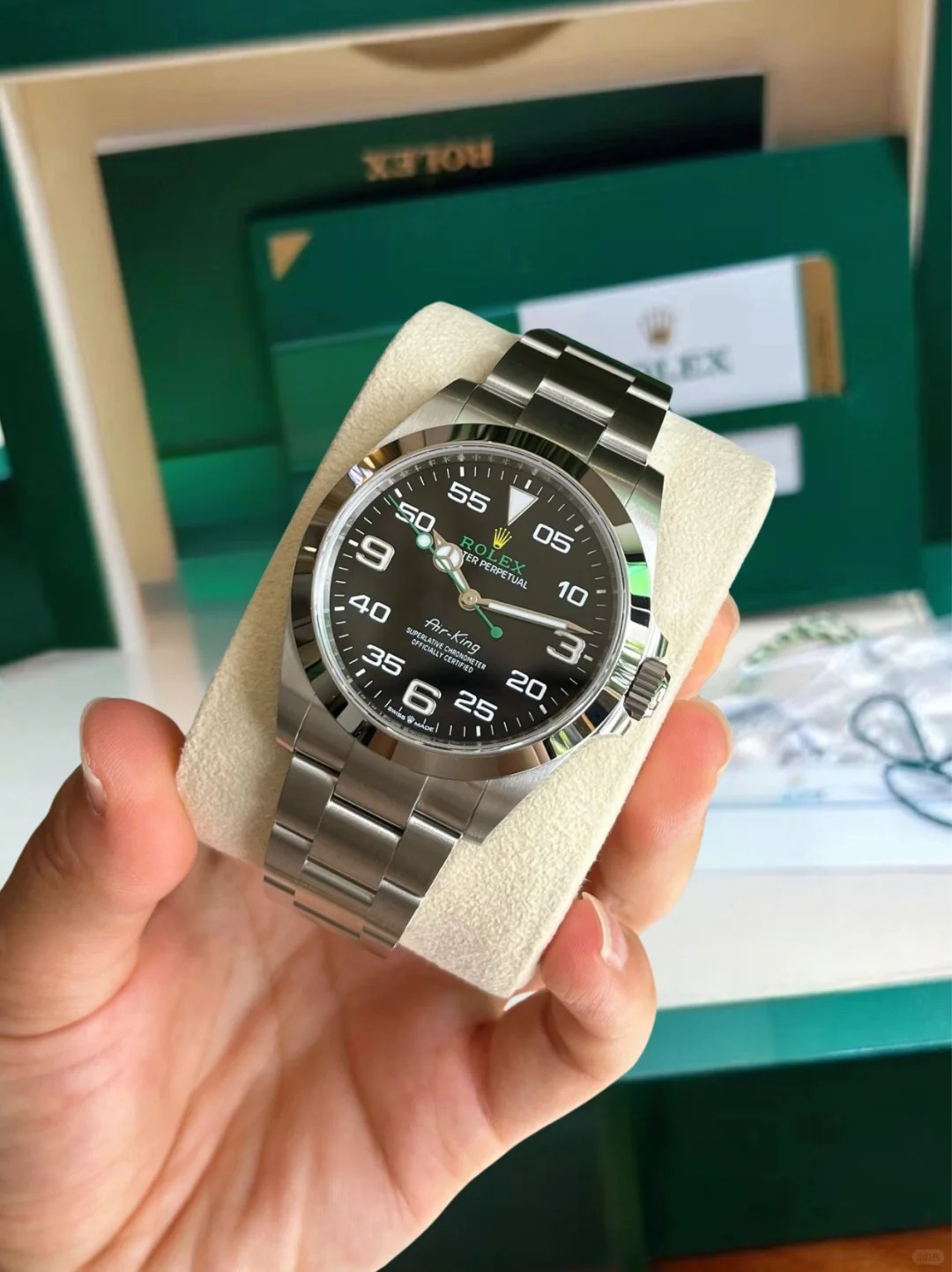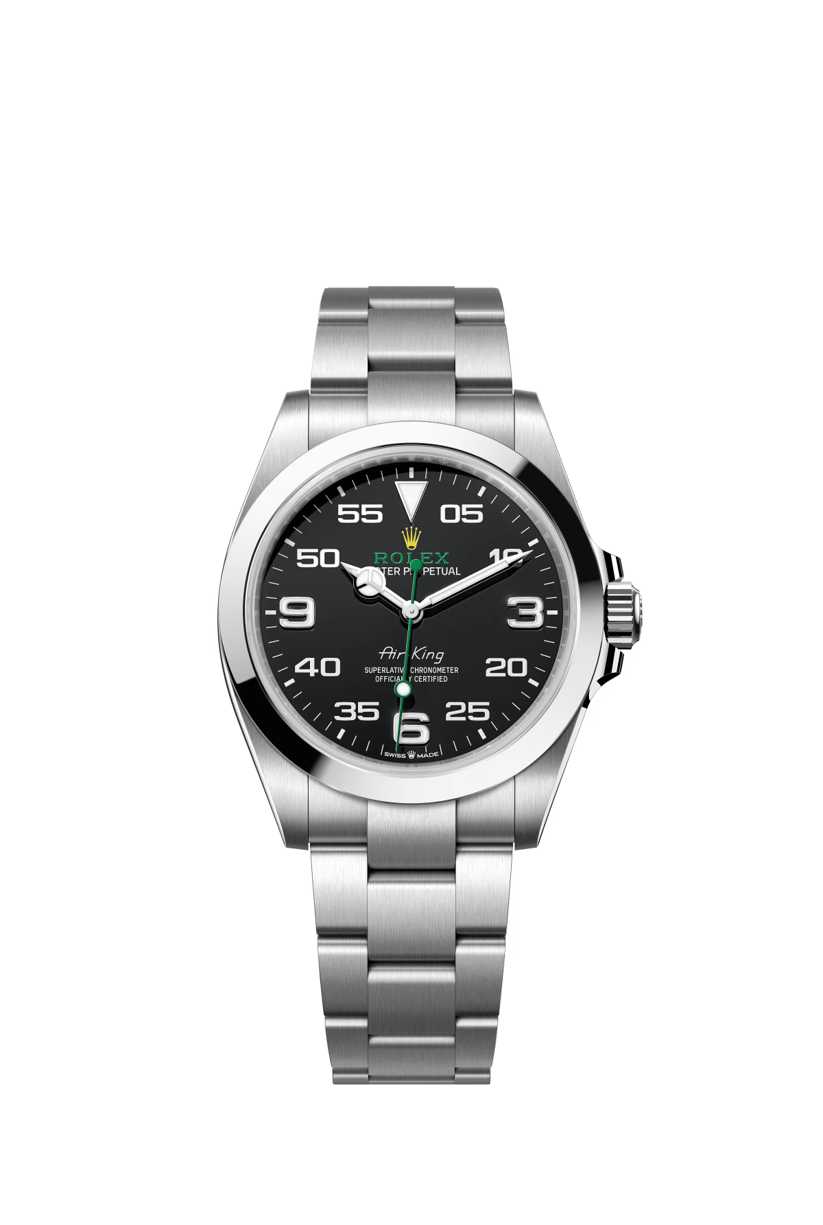 The 40 mm Oyster steel case. with its solid link Oyster bracelet and distinctive black dial. continues the original Rolex Oyster's roots in aviation. -m126900-0001