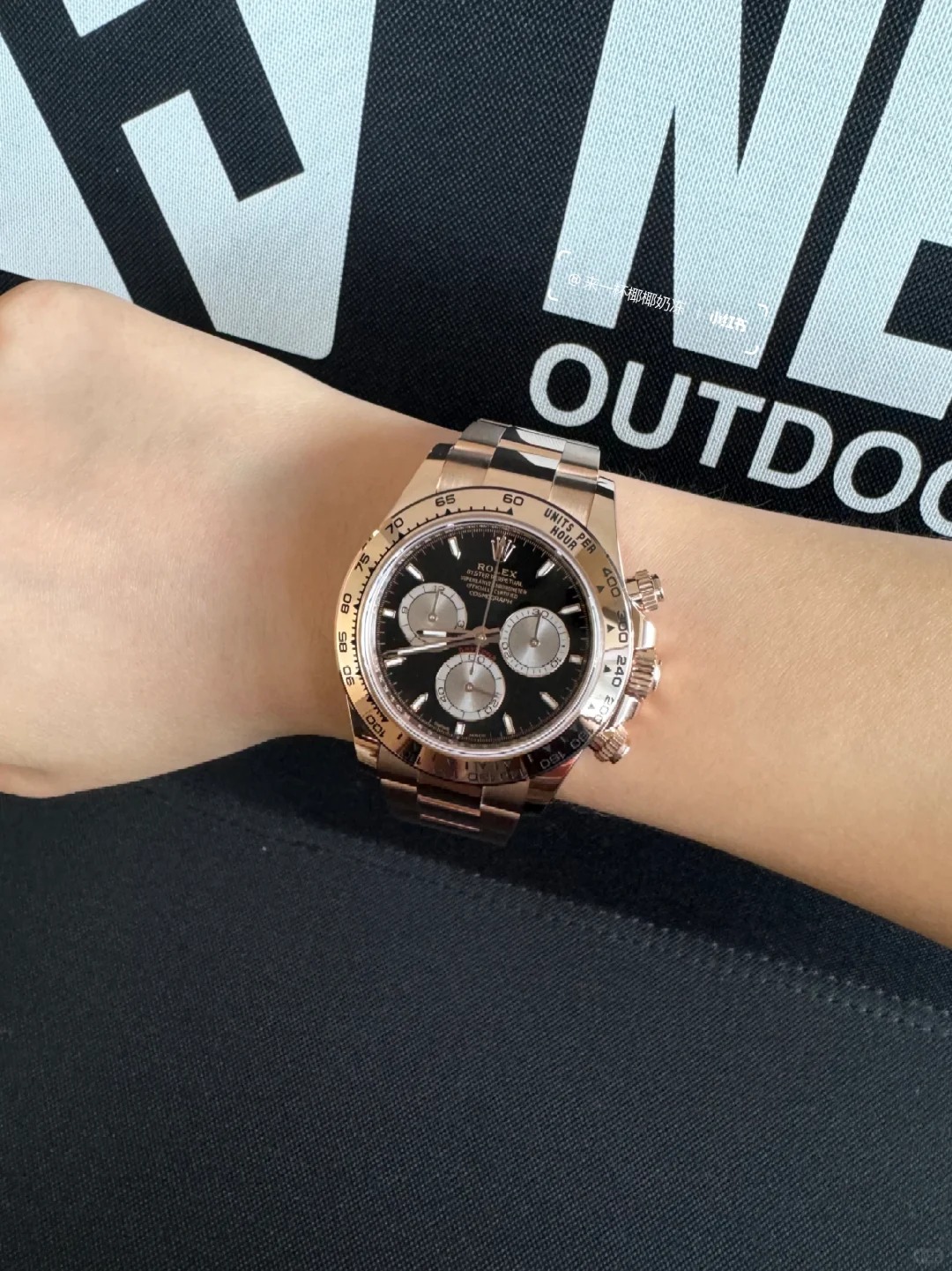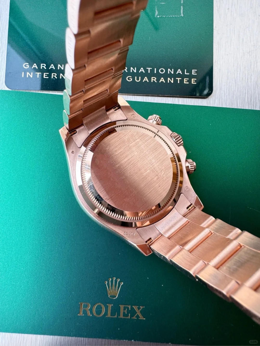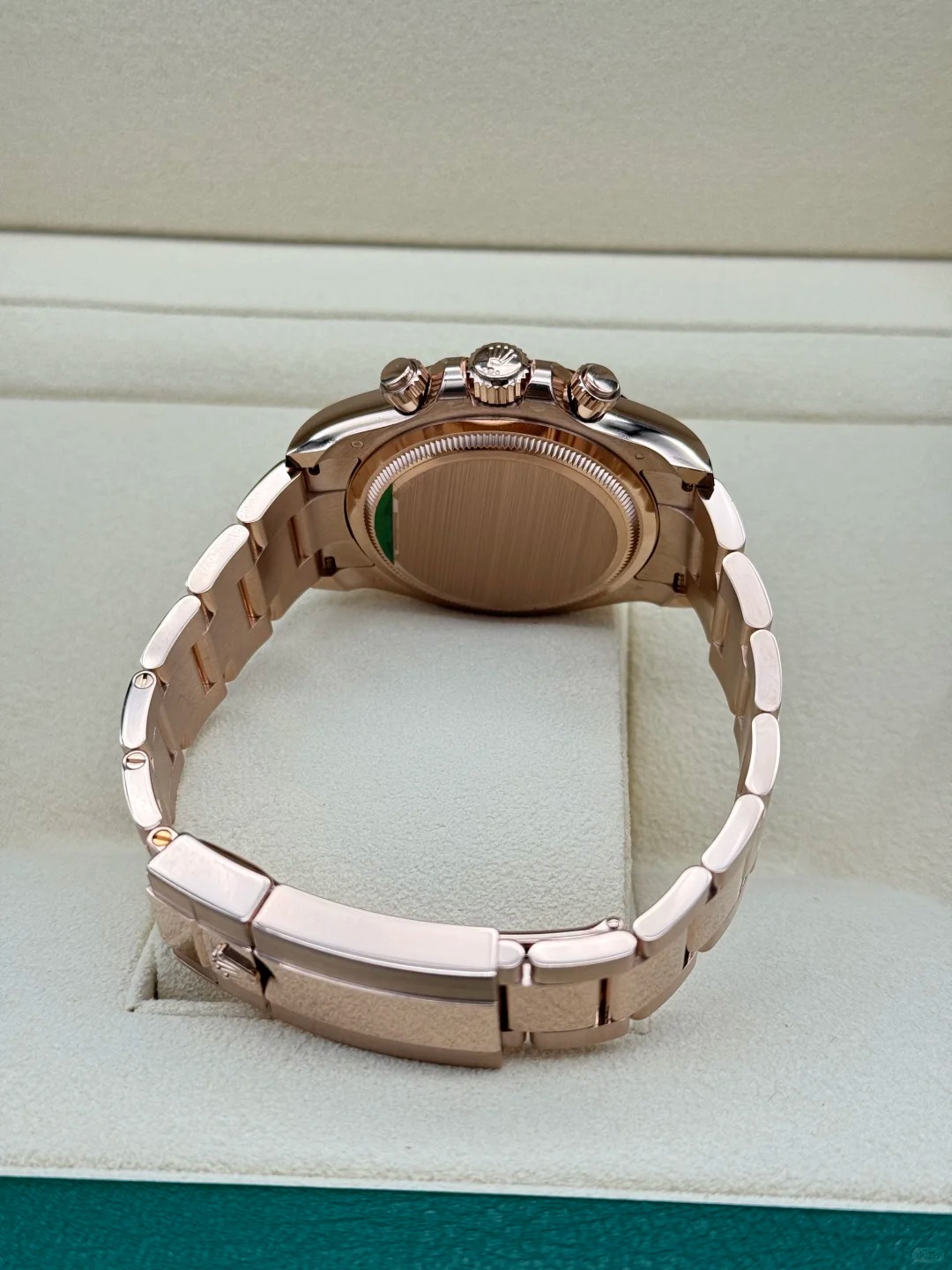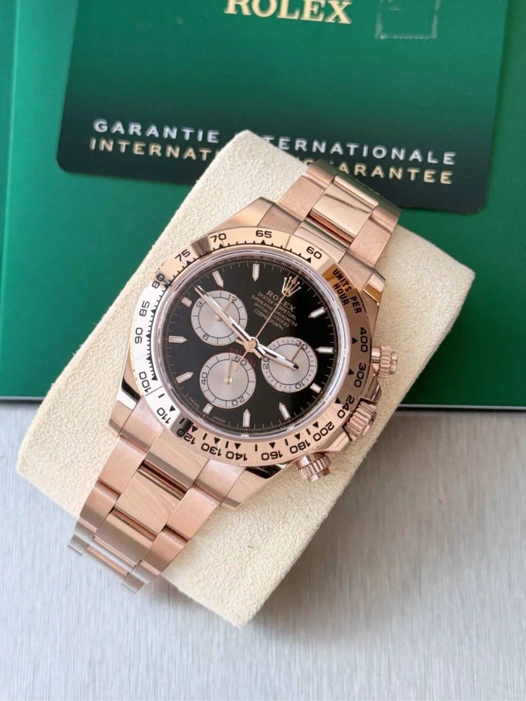 The Oyster Perpetual Cosmograph Daytona in 18 ct Everose gold features a glossy black and sunrise gold dial and an Oyster bracelet with an engraved tachymeter on an 18-carat Everose gold bezel. -m126505-0001 40mm