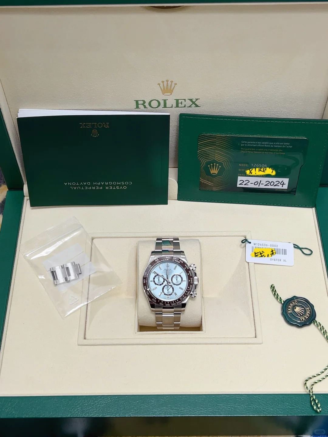 The watch is unworn and comes complete with full set of original accessories. such as watch box. warranty card dated recently. booklets and manuals.