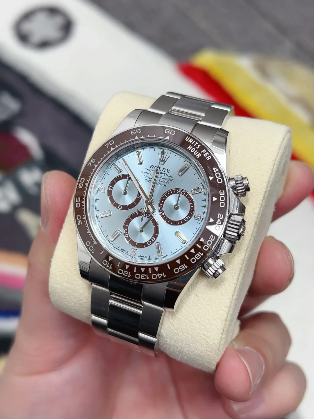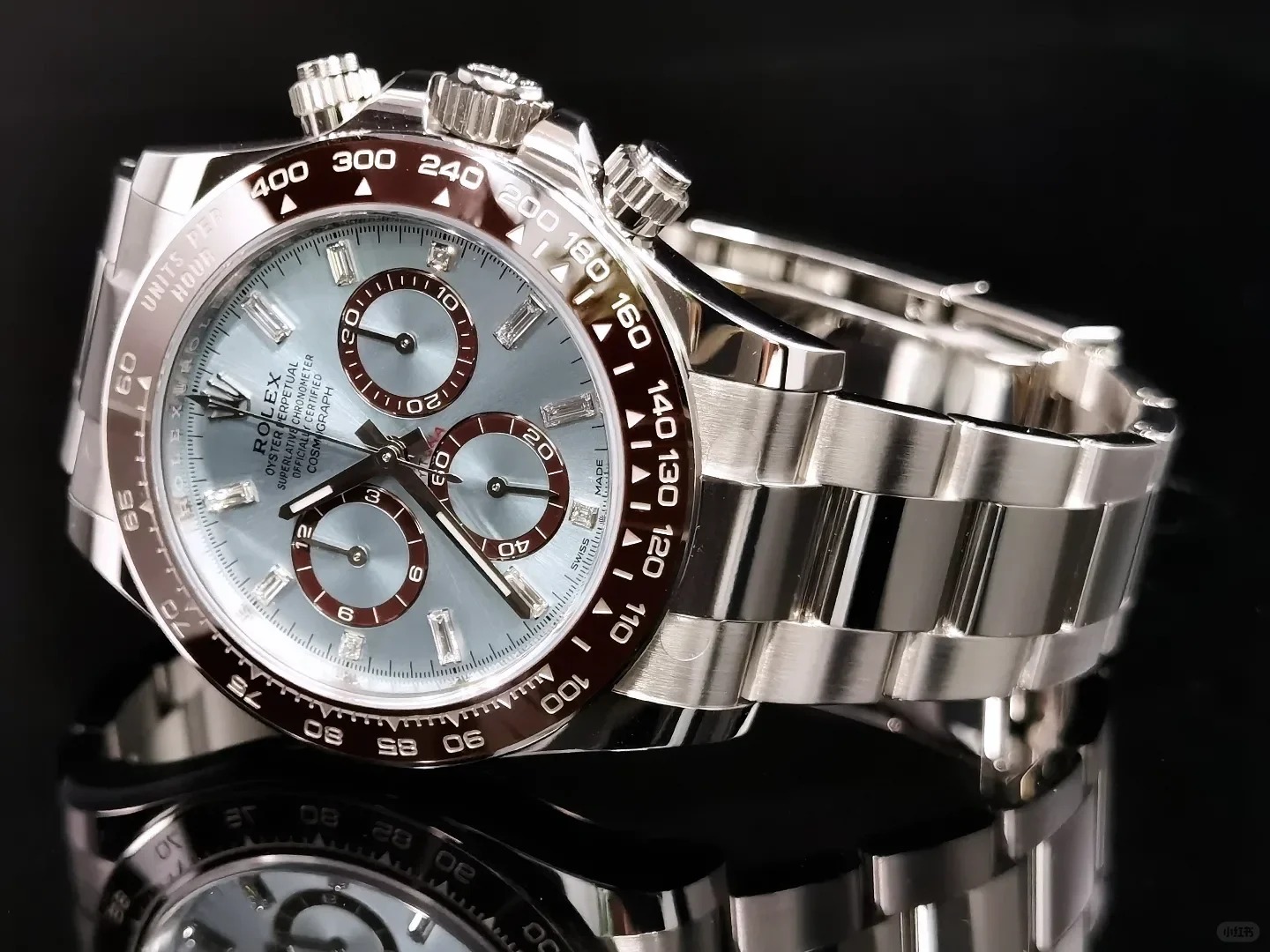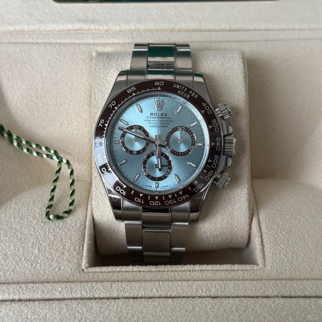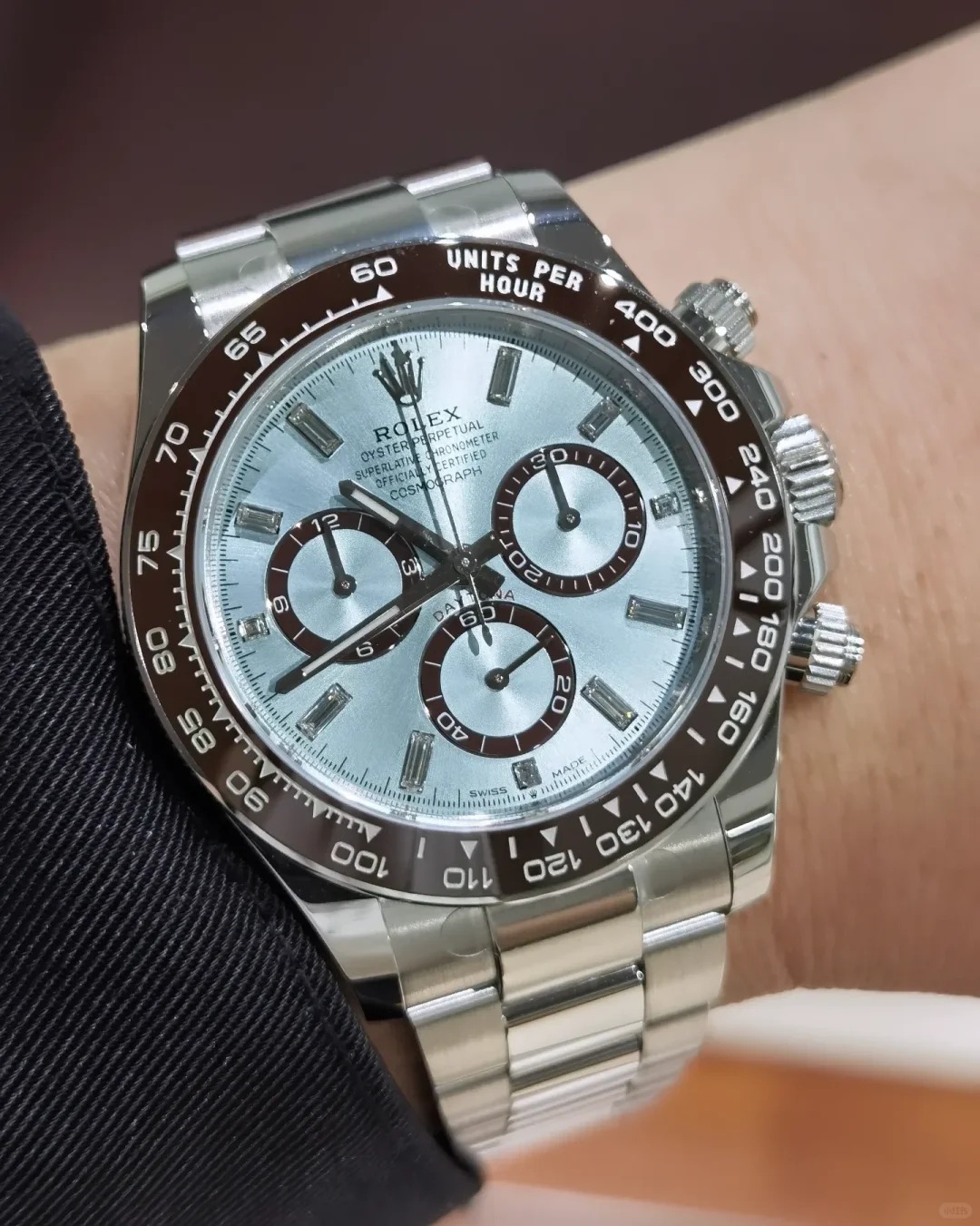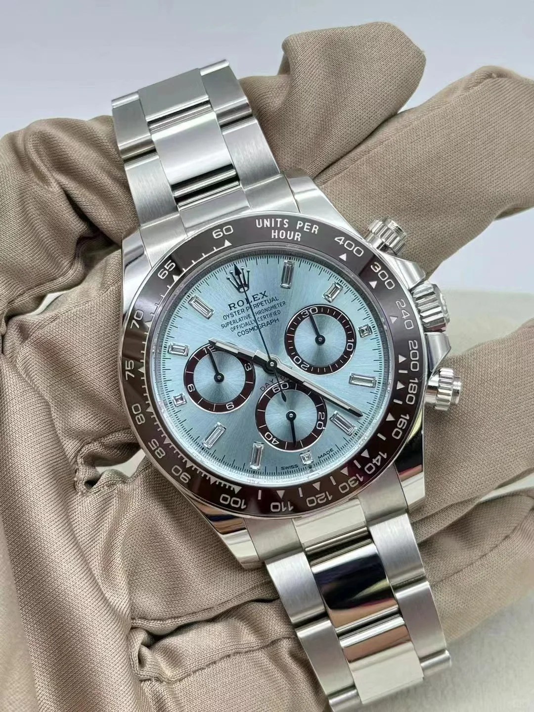 The Oyster Perpetual Cosmograph Daytona in platinum features an ice-blue diamond-set dial with contrasting counters. The watch is fitted with an Oyster bracelet and a chestnut brown Cerachrom bezel with a tachymeter. -m126506-0002 40mm