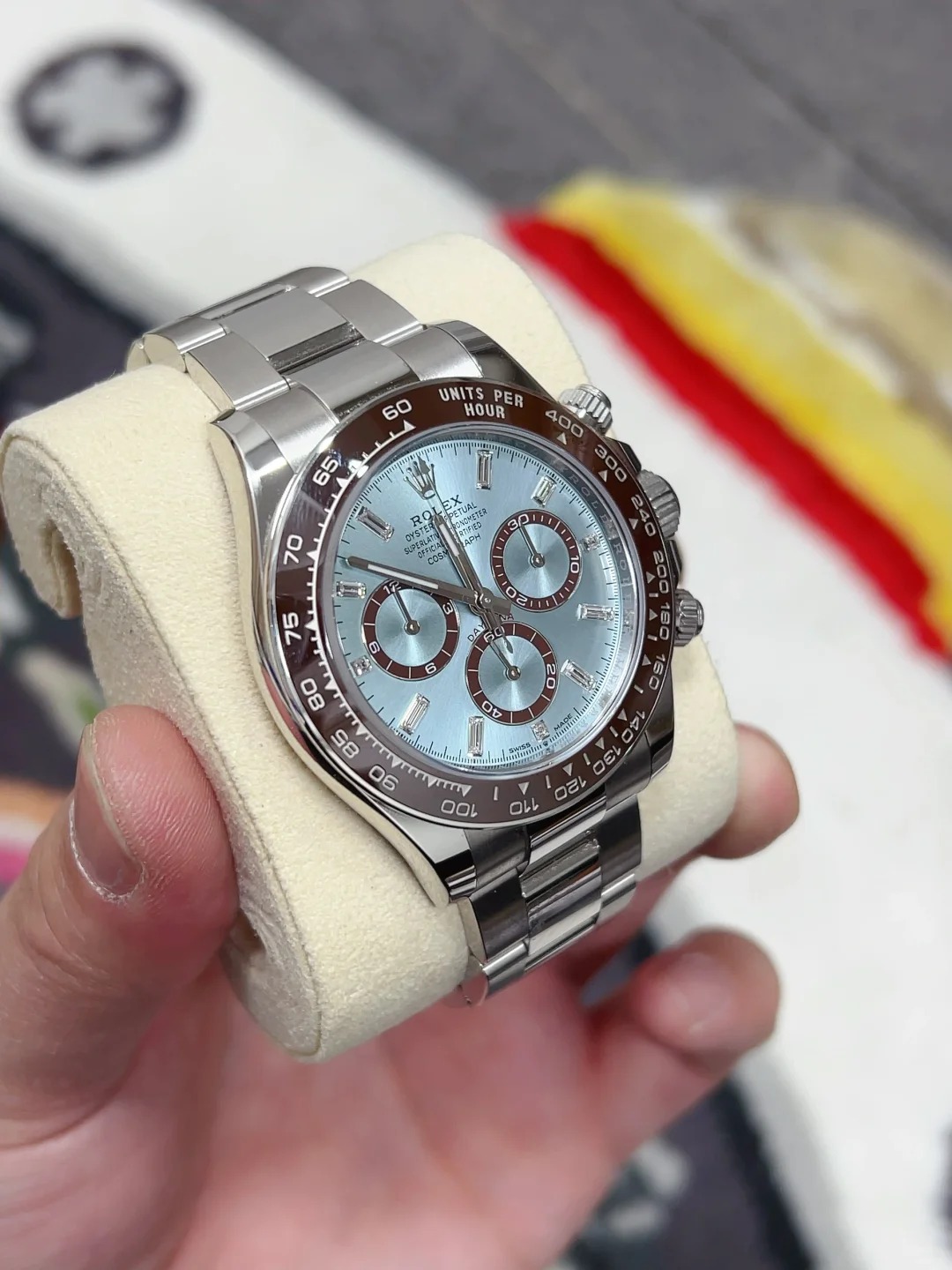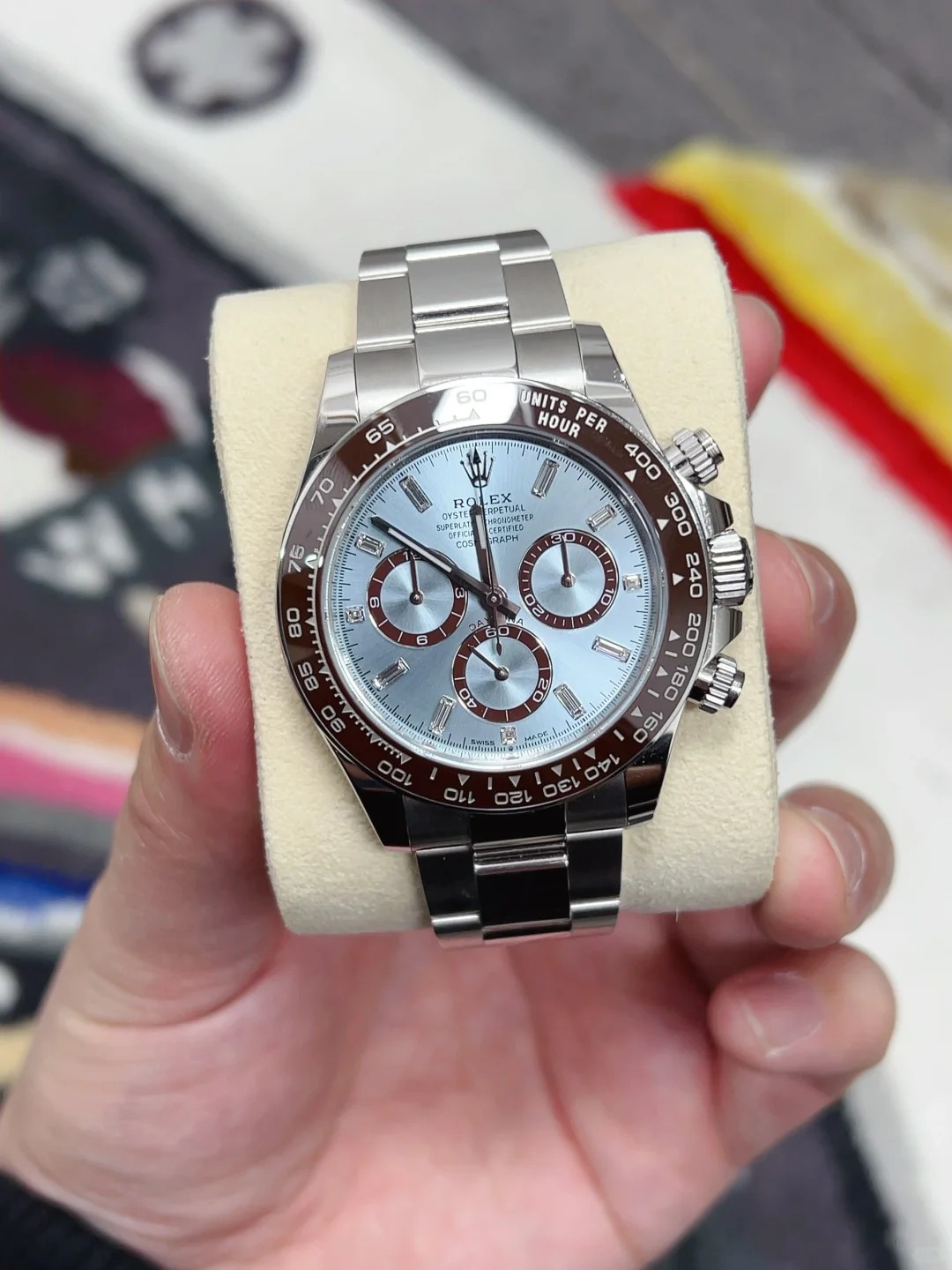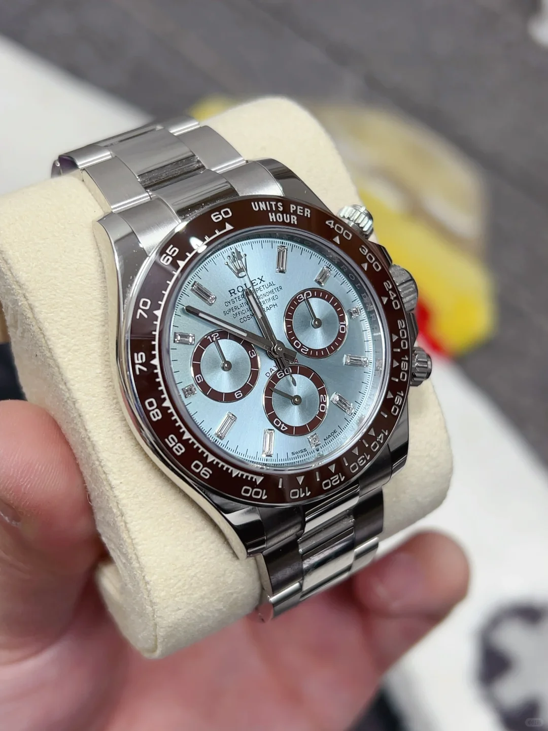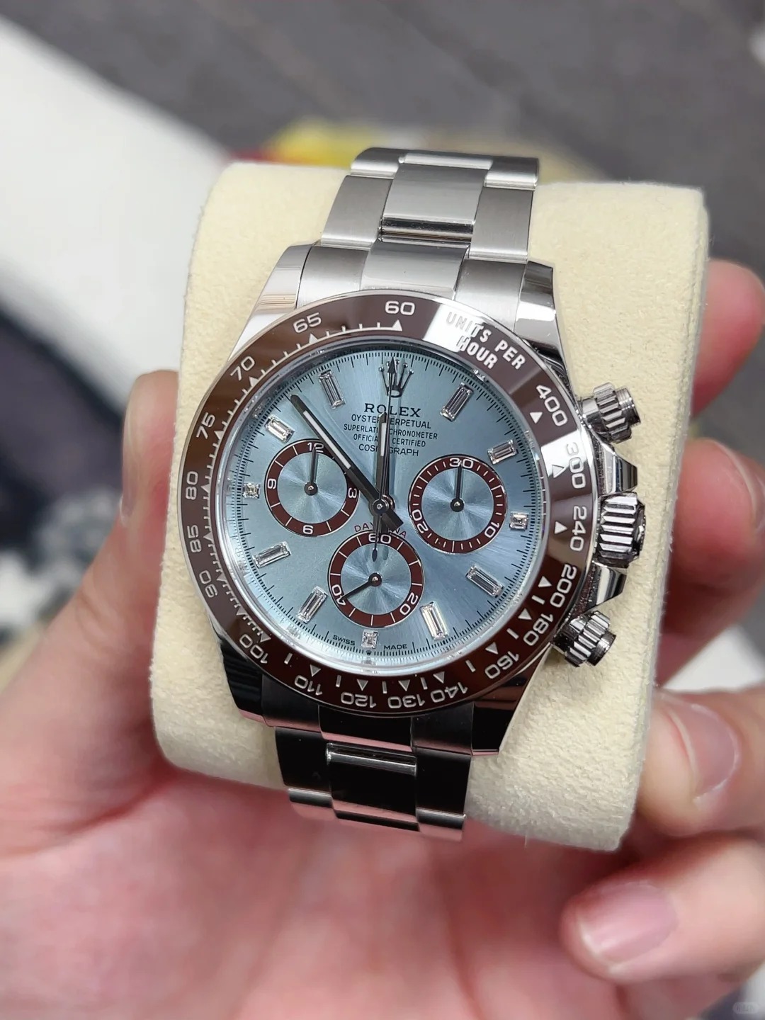 The Oyster Perpetual Cosmograph Daytona in platinum features an ice-blue diamond-set dial with contrasting counters. The watch is fitted with an Oyster bracelet and a chestnut brown Cerachrom bezel with a tachymeter. -m126506-0002 40mm