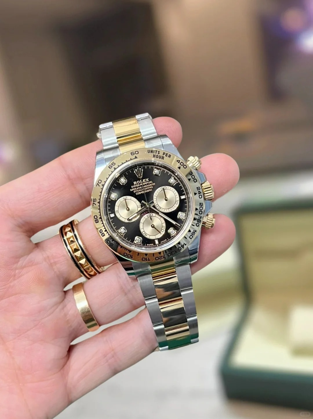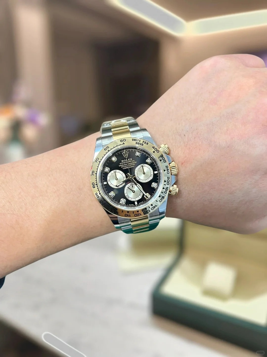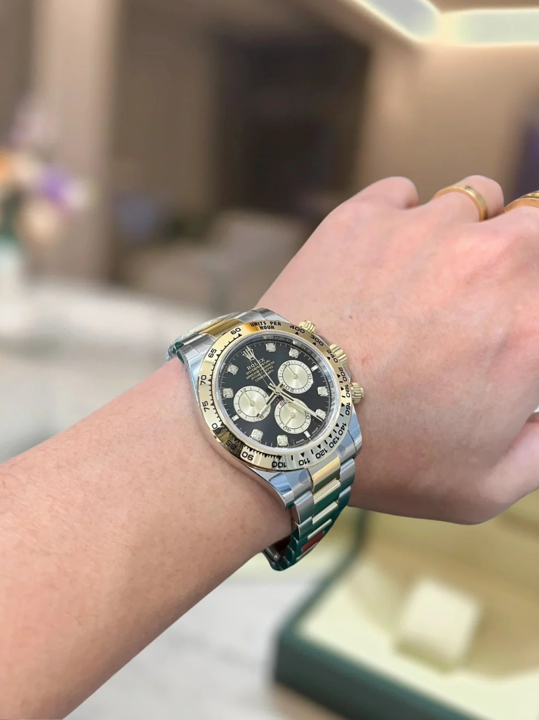 The Oyster Perpetual Cosmograph Daytona in yellow gold and Oystersteel features a diamond-set shiny black and gold dial and an Oyster bracelet with a tachymeter engraved on a yellow gold bezel. -m126503-0002 40mm