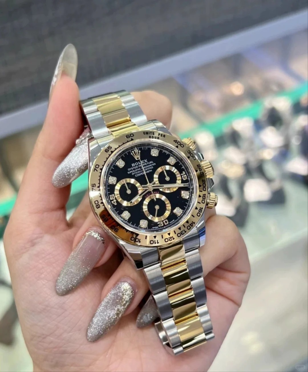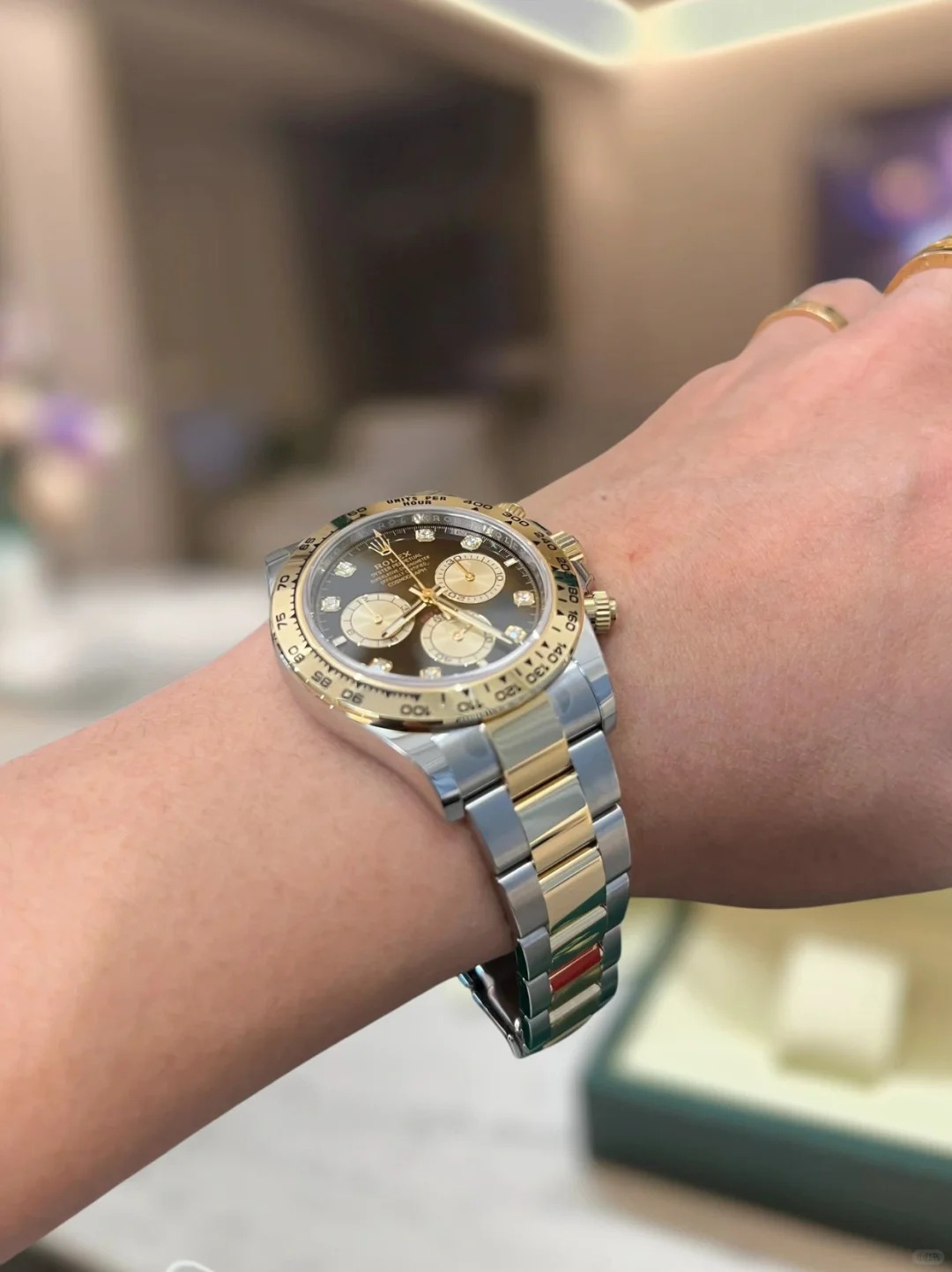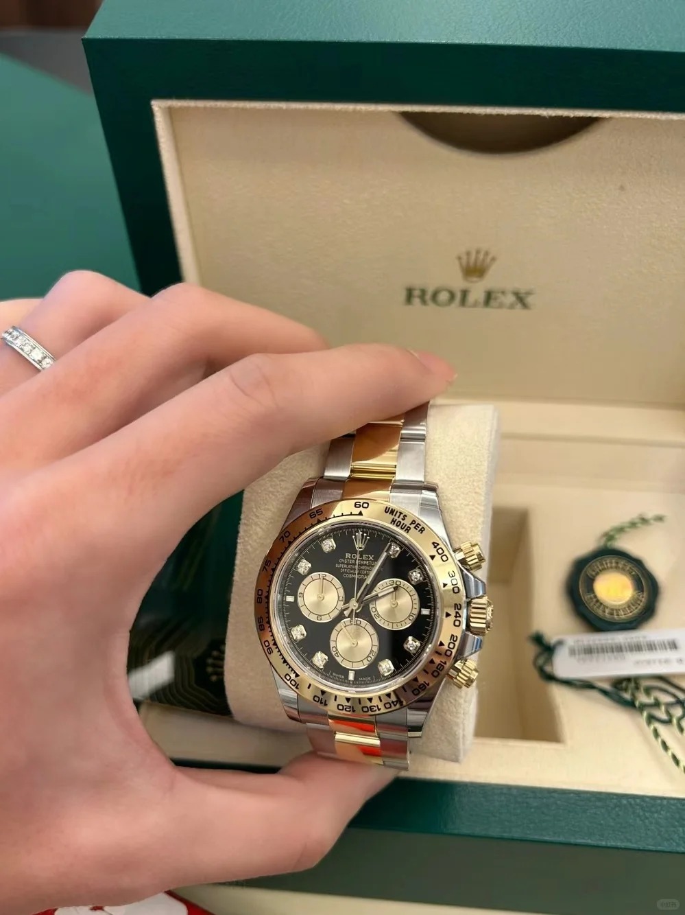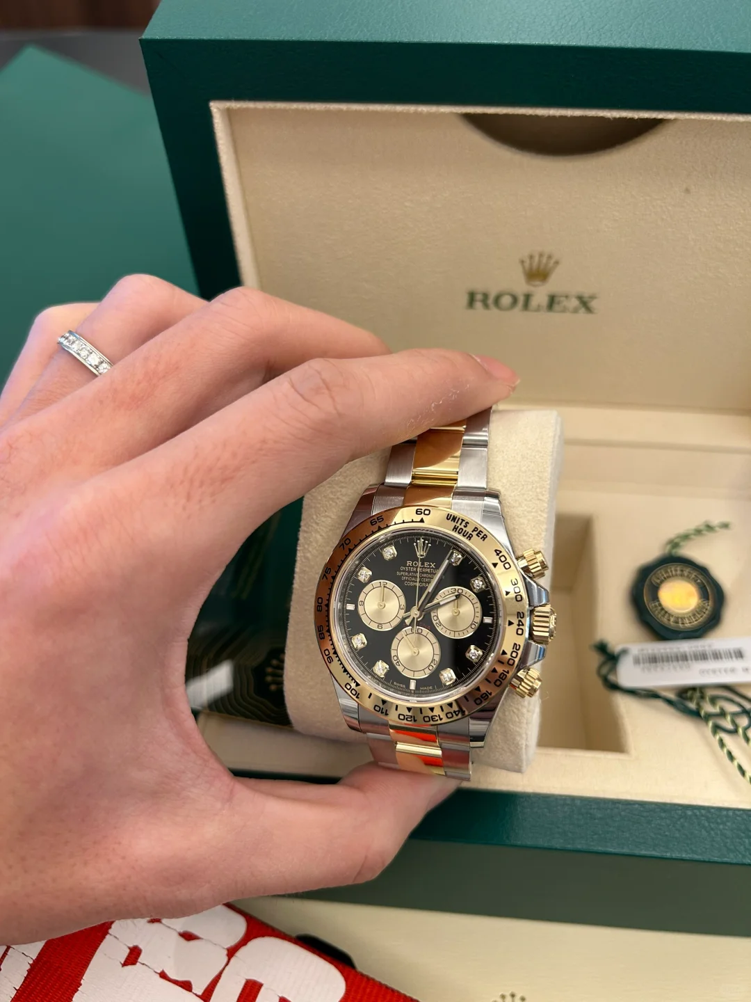 The Oyster Perpetual Cosmograph Daytona in yellow gold and Oystersteel features a diamond-set shiny black and gold dial and an Oyster bracelet with a tachymeter engraved on a yellow gold bezel. -m126503-0002 40mm