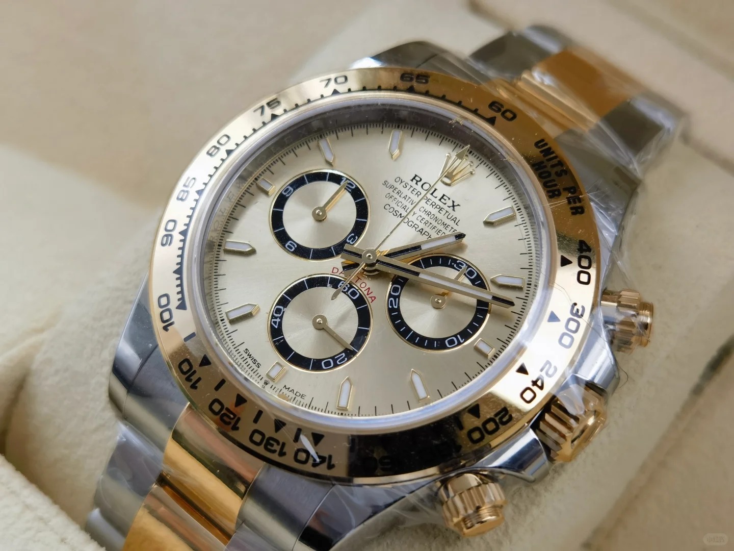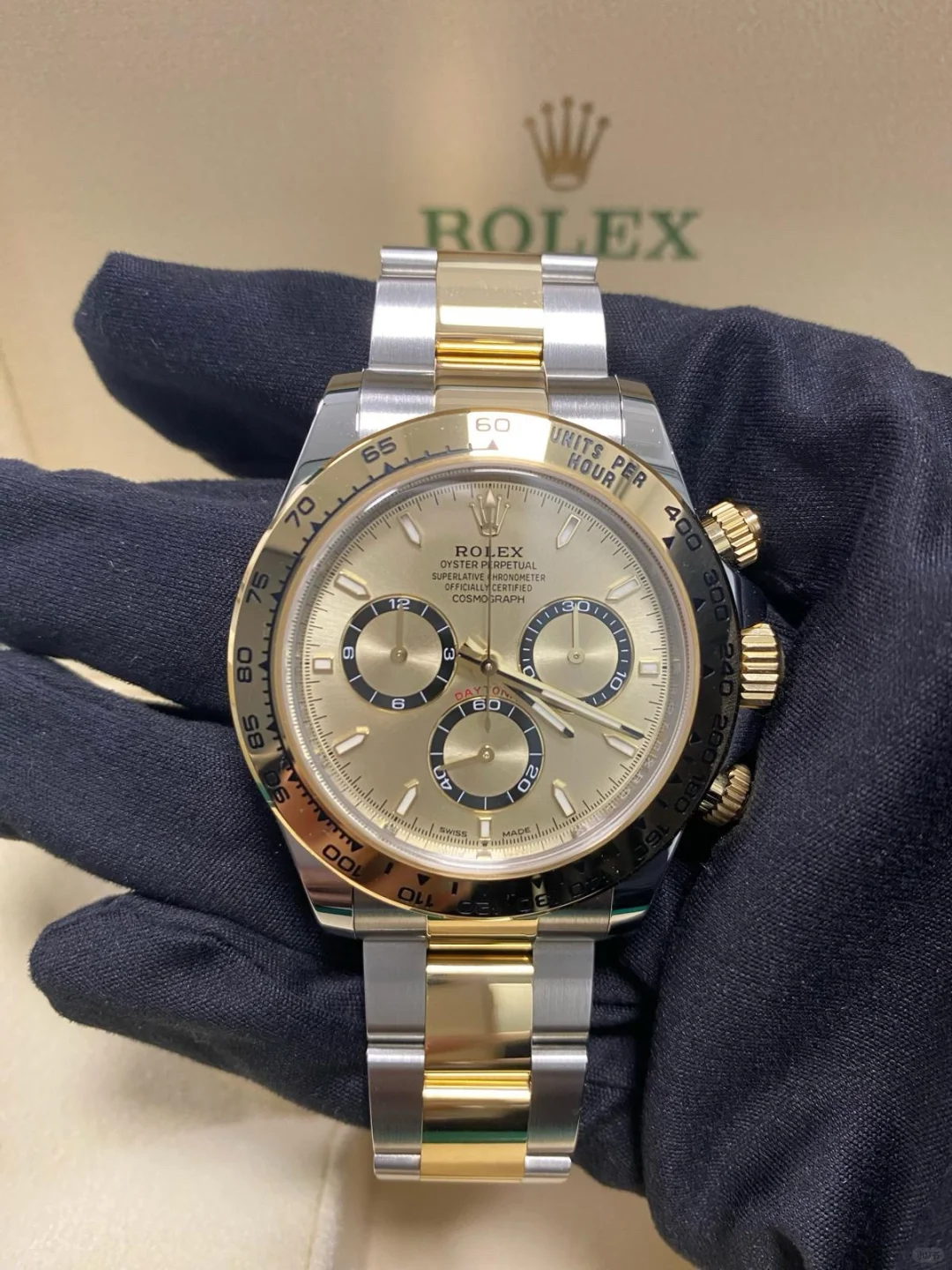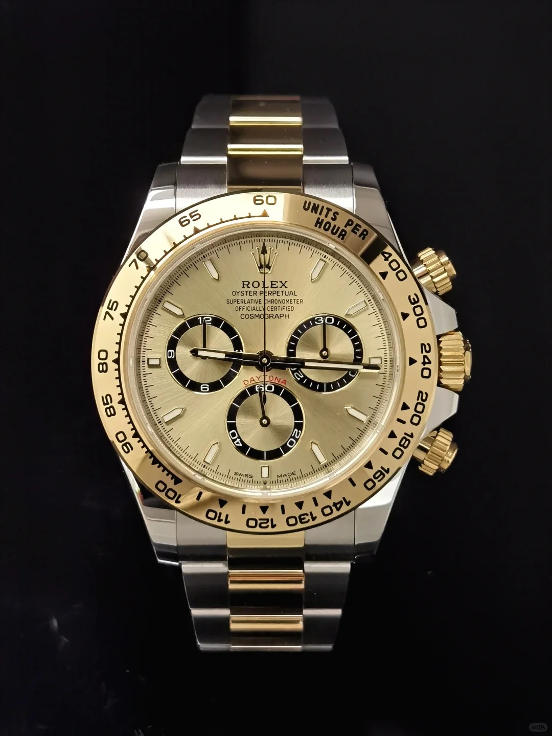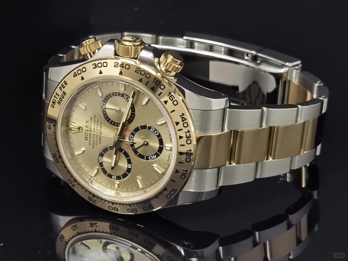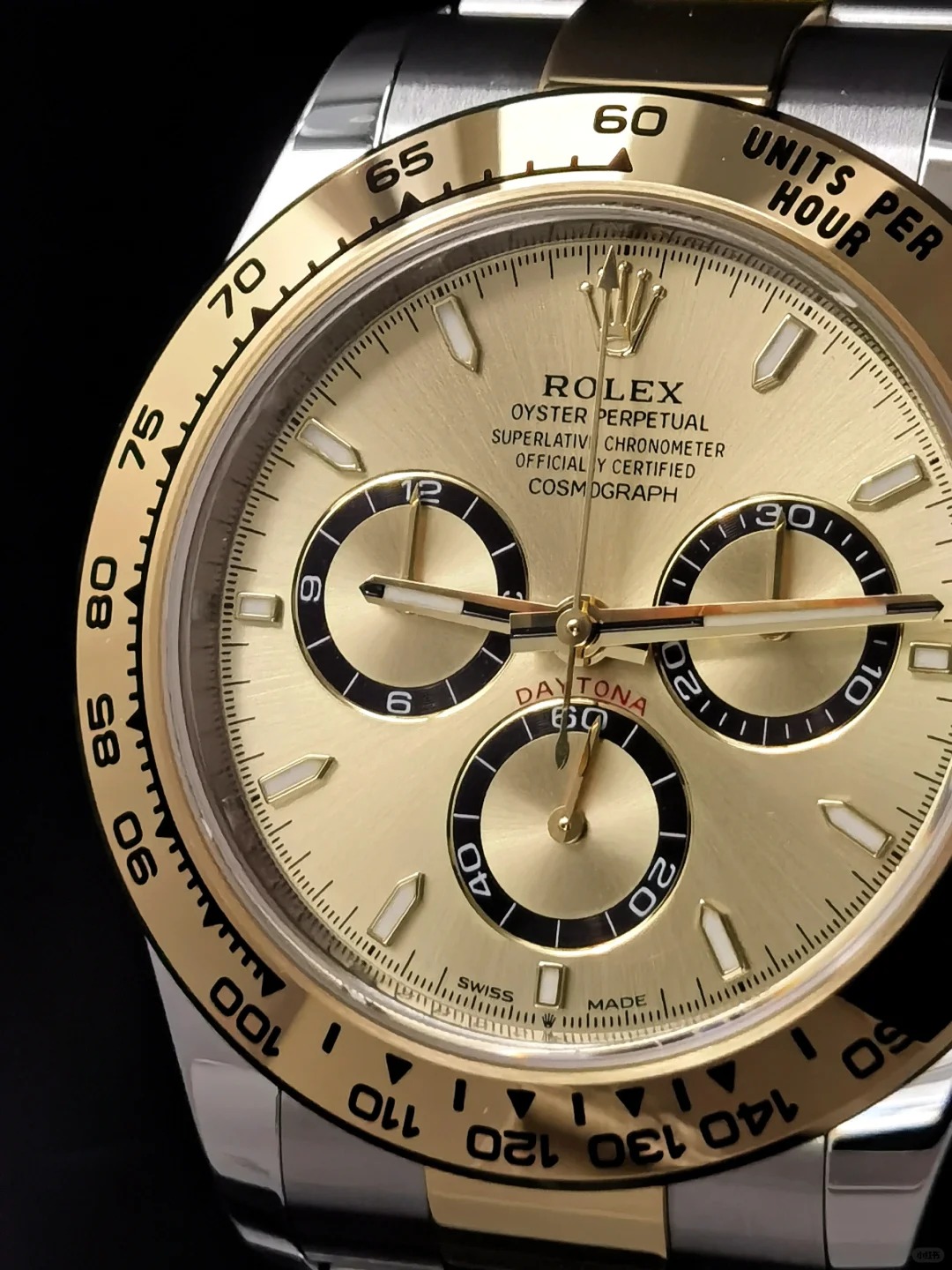 • The Oyster Perpetual Cosmograph Daytona is available in yellow gold and Oystersteel with a gold dial and contrasting counters. The watch is fitted with an Oyster bracelet with a tachymeter engraved on a yellow gold bezel. -m126503-0004 40mm