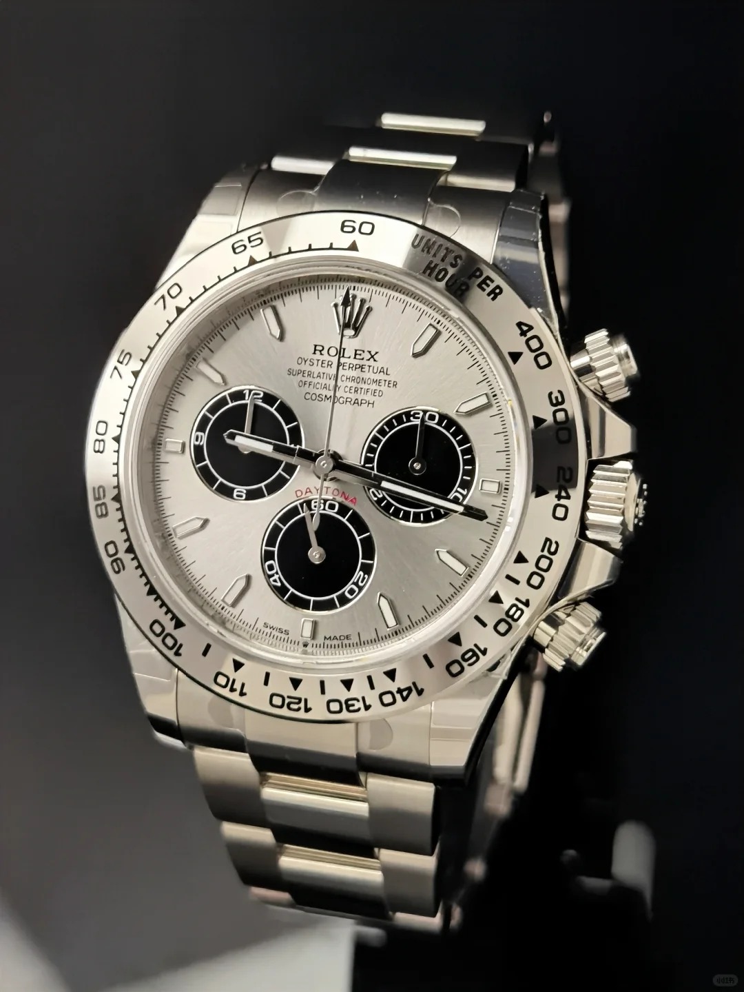 The Oyster Perpetual Cosmograph Daytona in 18-carat white gold with stainless steel and gloss black dial and Oyster bracelet with an engraved tachymeter on an 18-carat white gold bezel. -m126509-0003 40mm