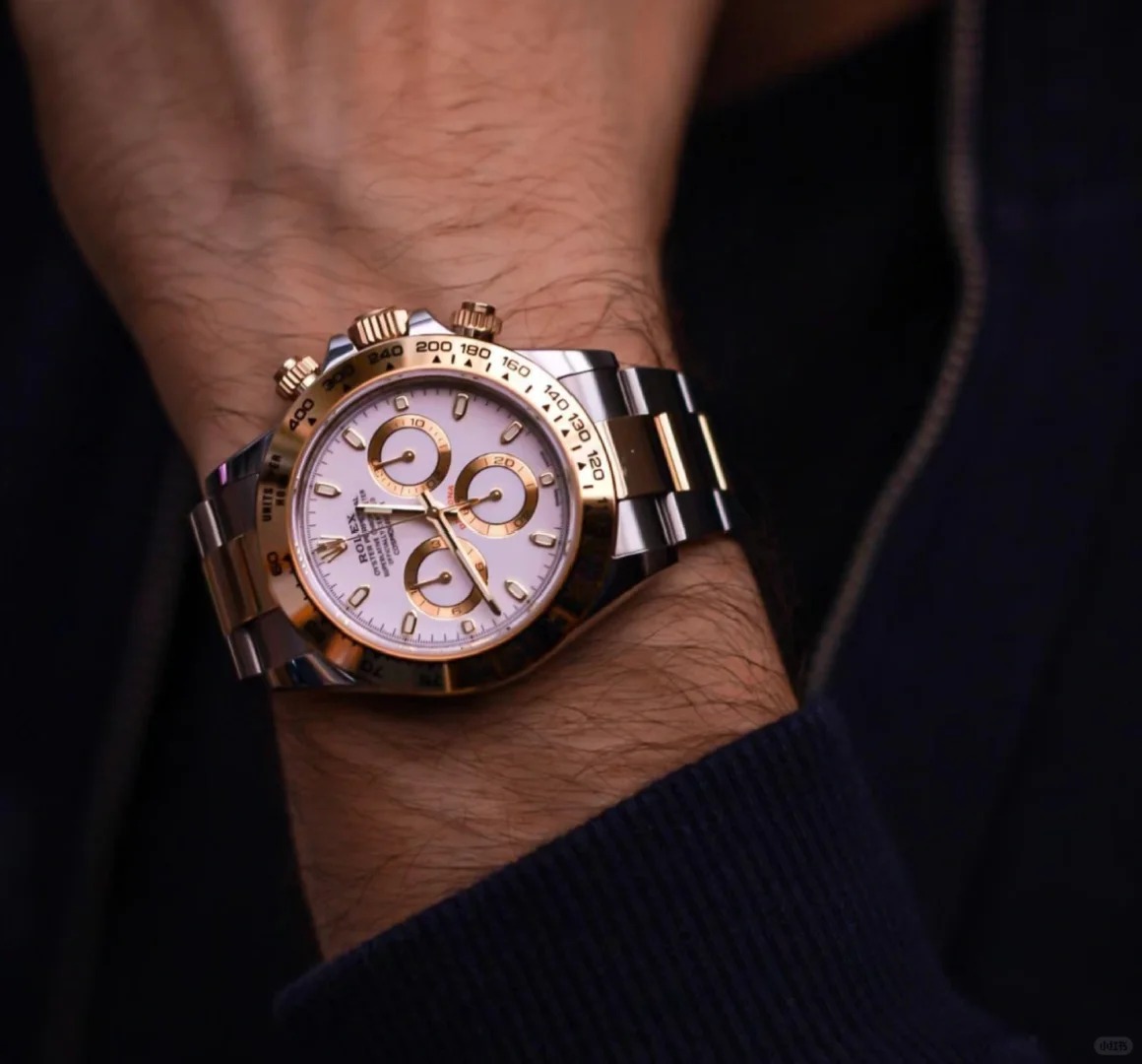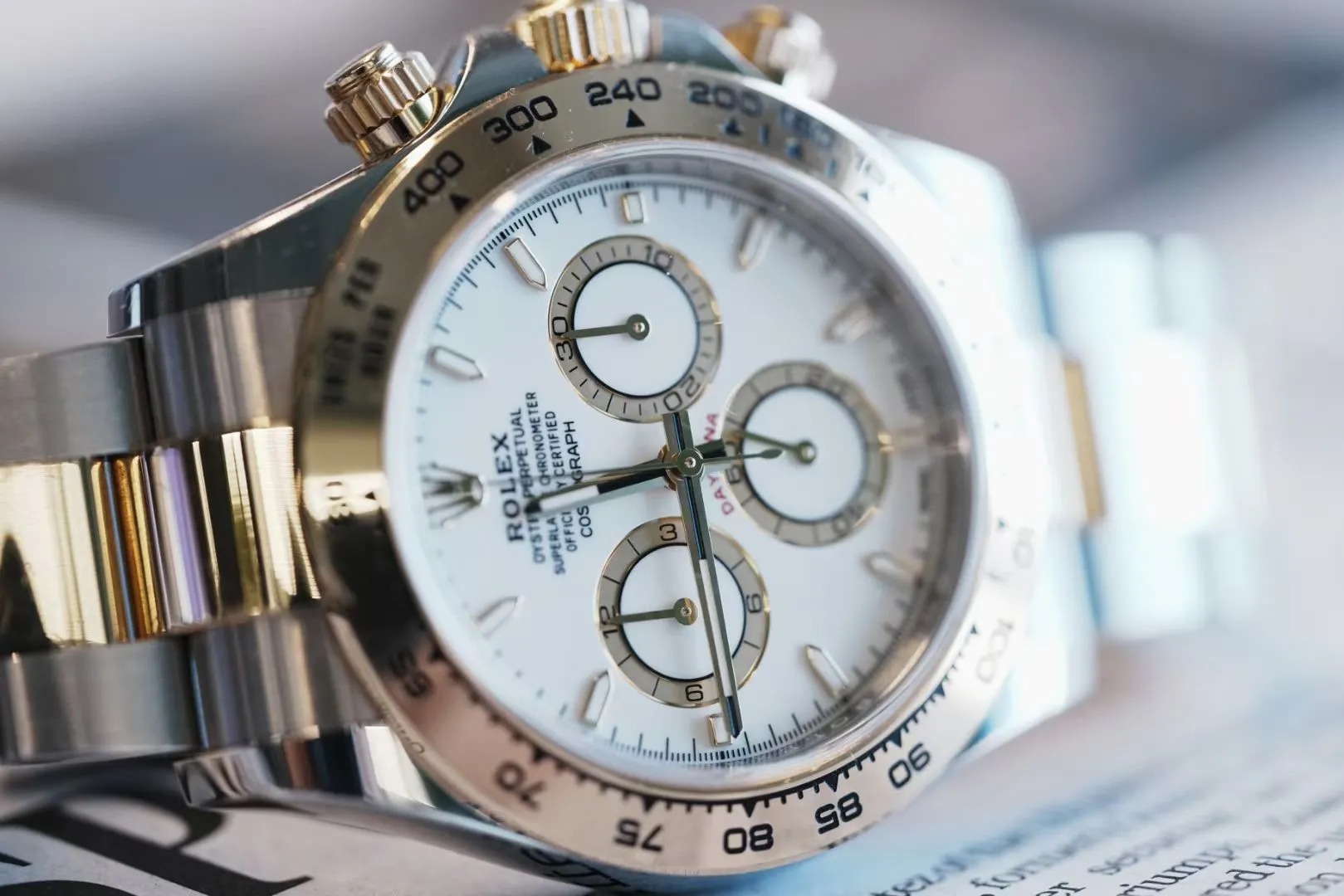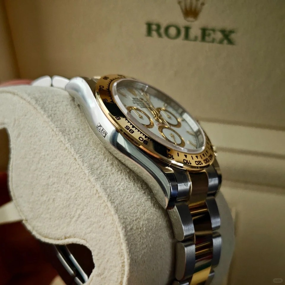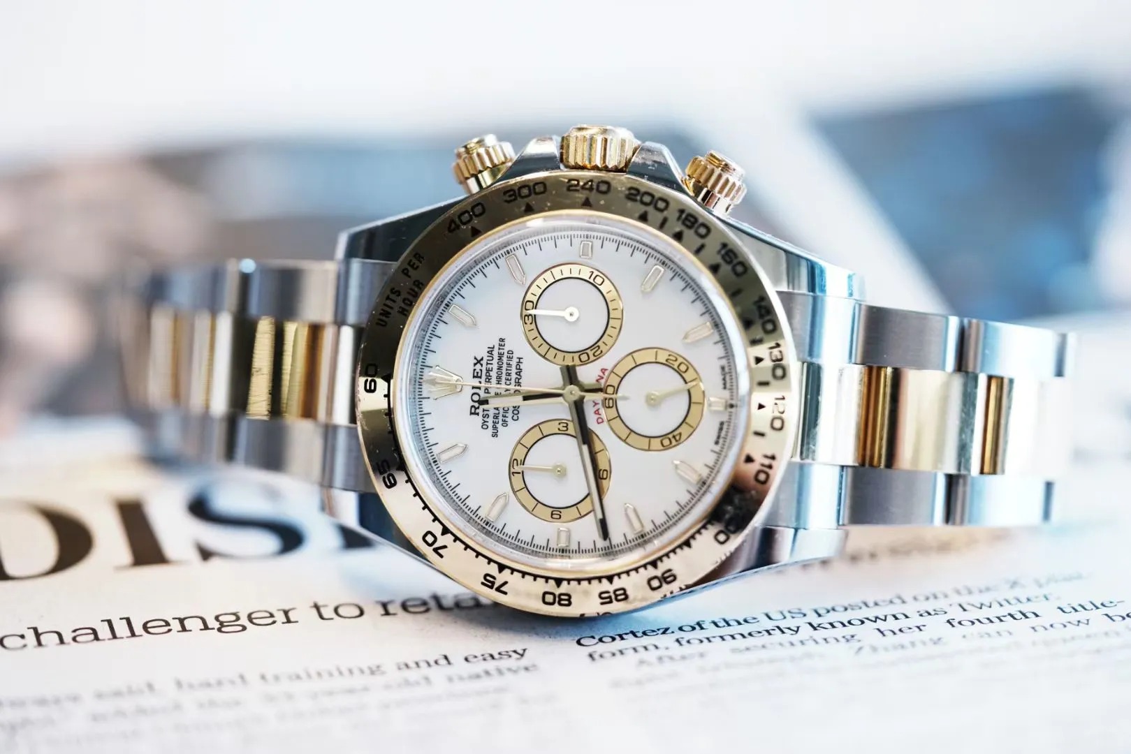 The Oyster Perpetual Cosmograph Daytona is available in yellow gold and Oystersteel with a white dial and contrasting counters. The watch is fitted with an Oyster bracelet with a tachymeter engraved on a yellow gold bezel. -m126503-0001 40mm