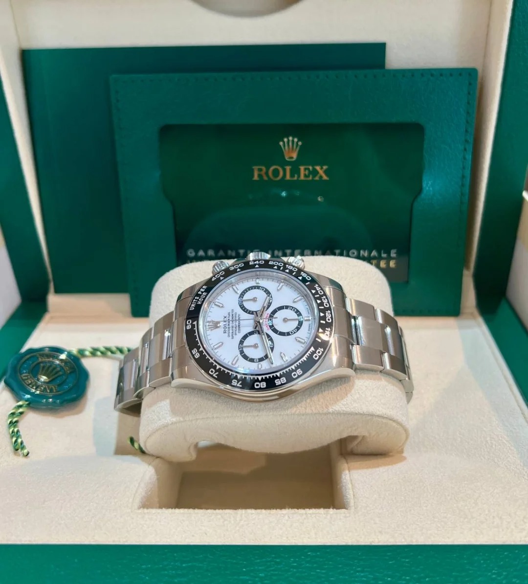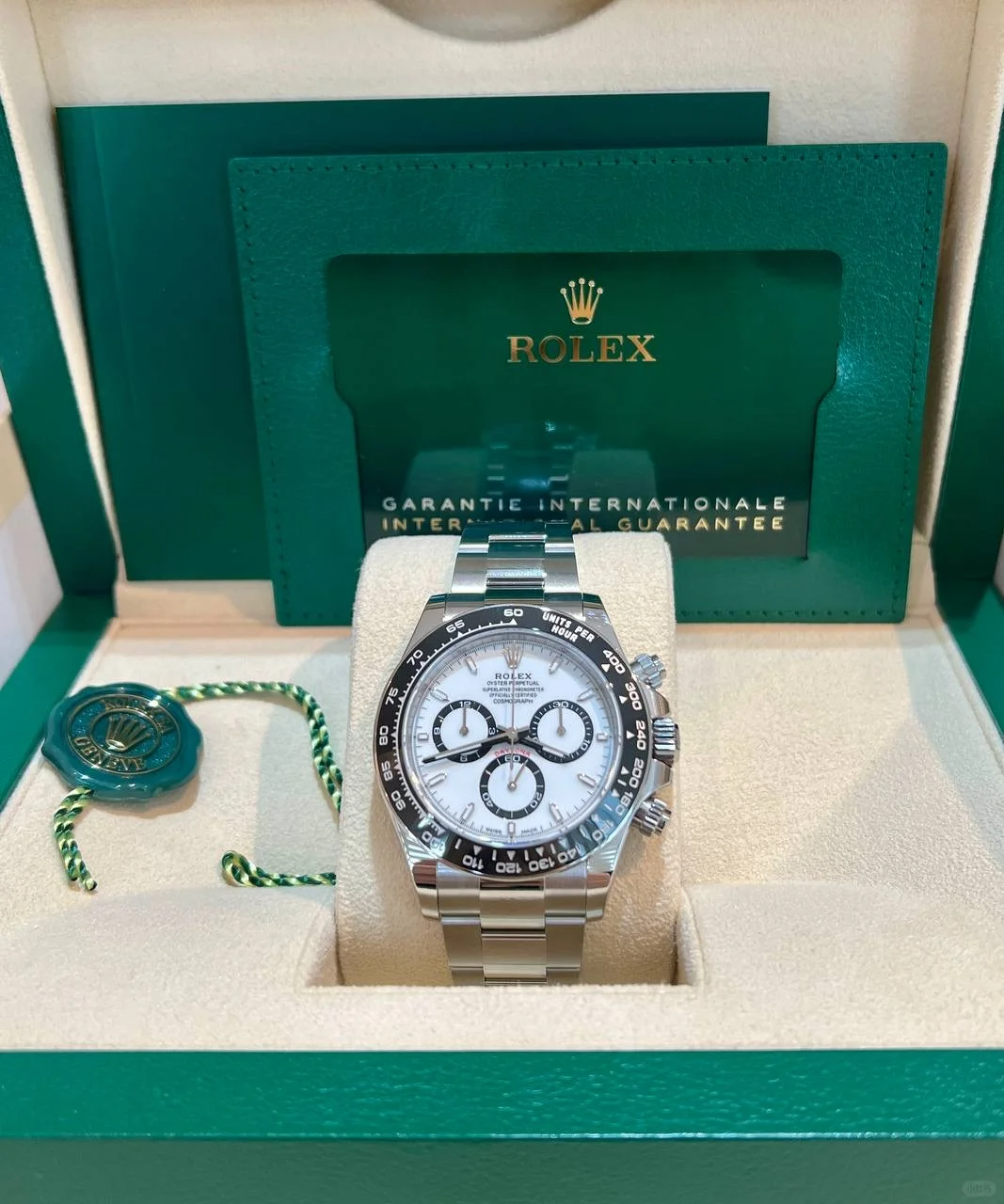 The Oyster Perpetual Cosmograph Daytona is made of Oyster steel with a white dial and contrasting counters. The watch is fitted with an Oyster bracelet and a black Cerachrom bezel with tachymeter. -m126500ln-0001 40mm
