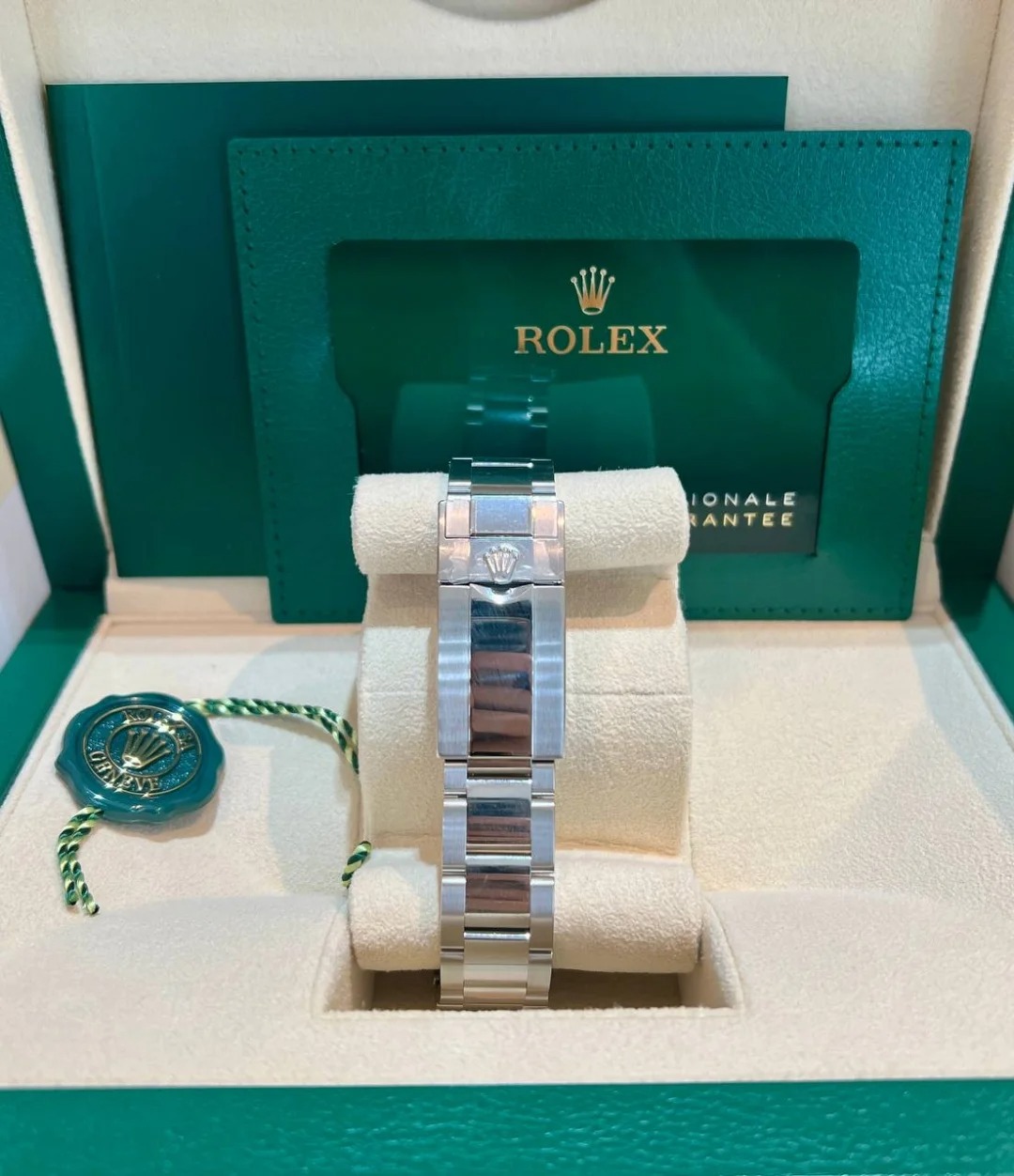 The watch is unworn and comes complete with full set of original accessories. such as watch box. warranty card dated recently. booklets and manuals.