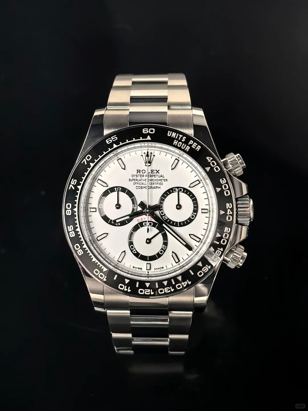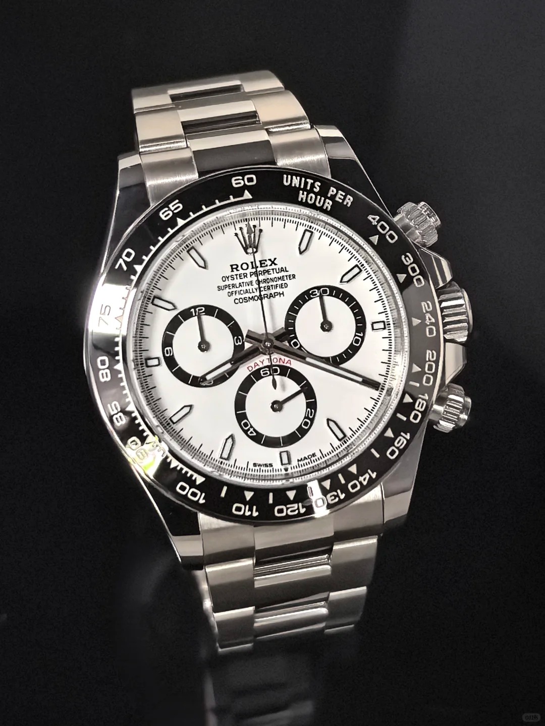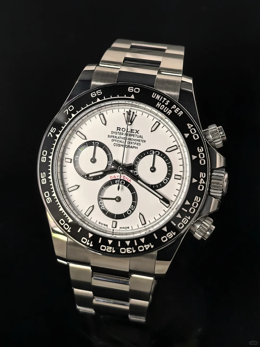 • The Oyster Perpetual Cosmograph Daytona is made of Oyster steel with a white dial and contrasting counters. The watch is fitted with an Oyster bracelet and a black Cerachrom bezel with tachymeter. -m126500ln-0001 40mm