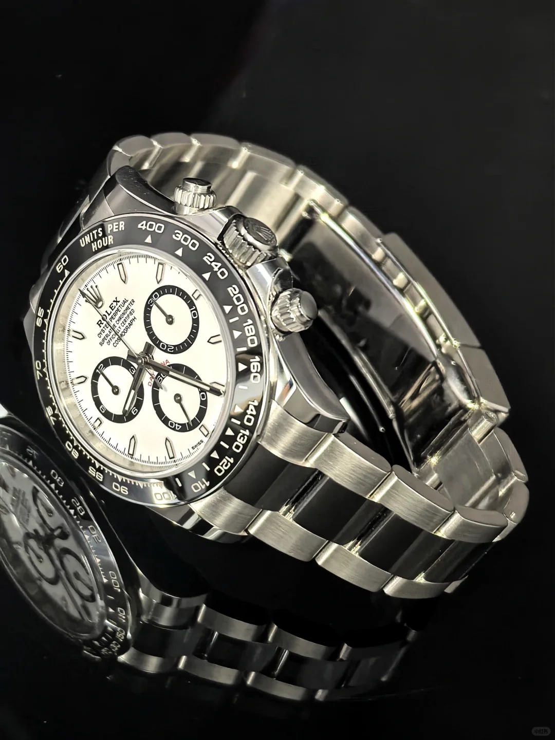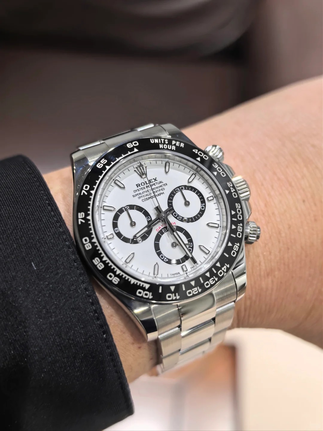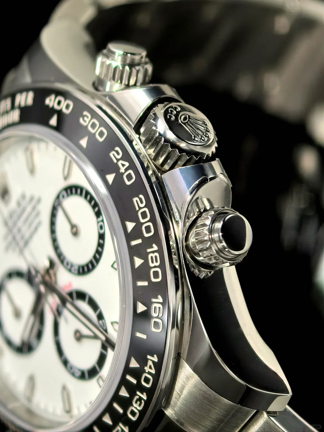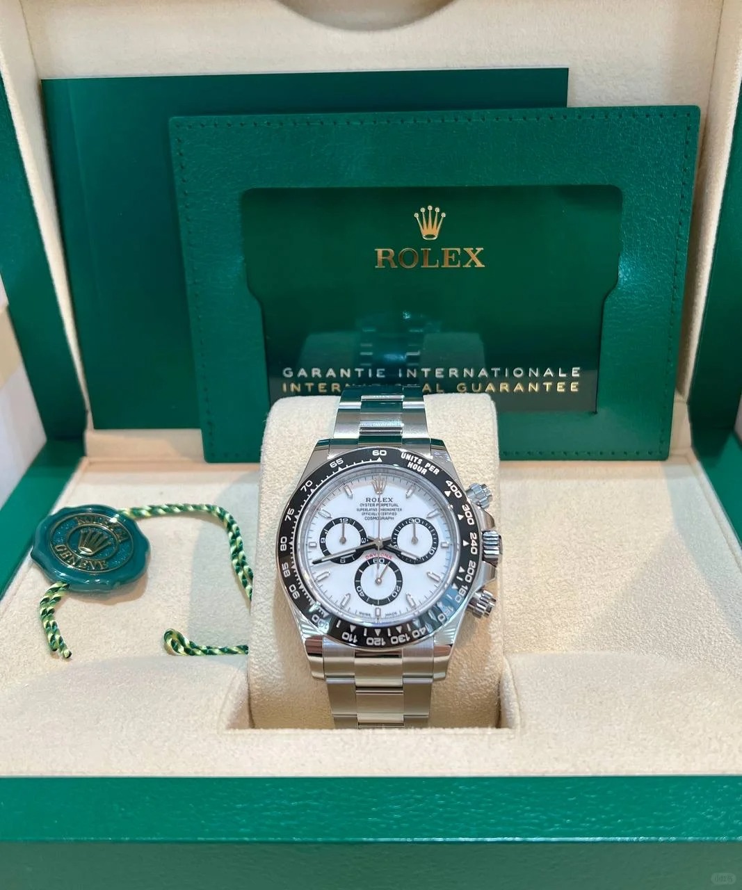 • The Oyster Perpetual Cosmograph Daytona is made of Oyster steel with a white dial and contrasting counters. The watch is fitted with an Oyster bracelet and a black Cerachrom bezel with tachymeter. -m126500ln-0001 40mm