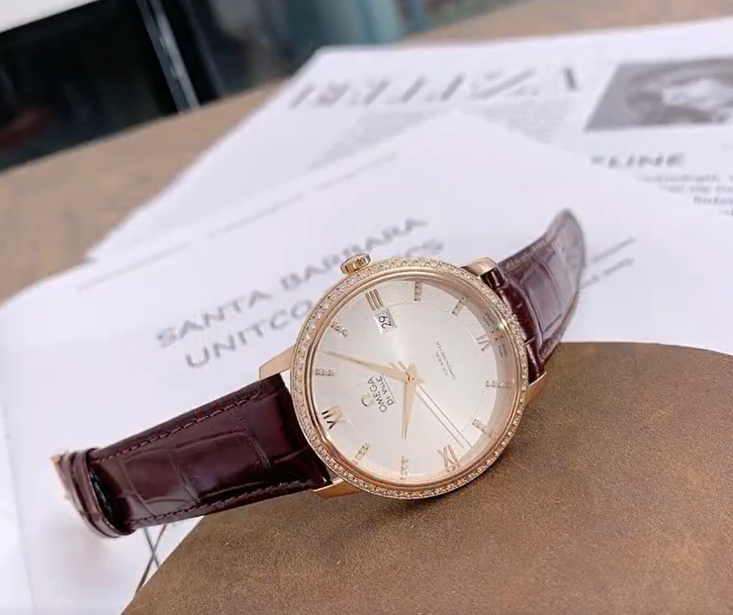Housed in a 39.5 mm 18K red gold case with a diamond-set bezel. the watch is presented on a brown leather strap and is powered by the OMEGA Co-Axial calibre 2500.