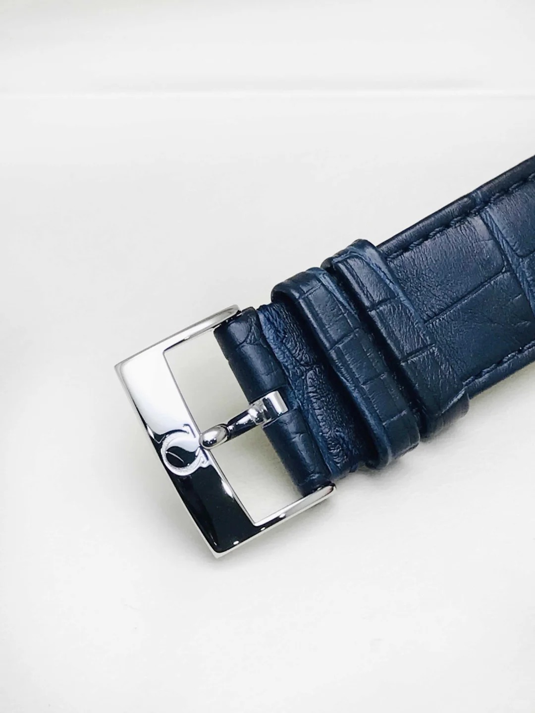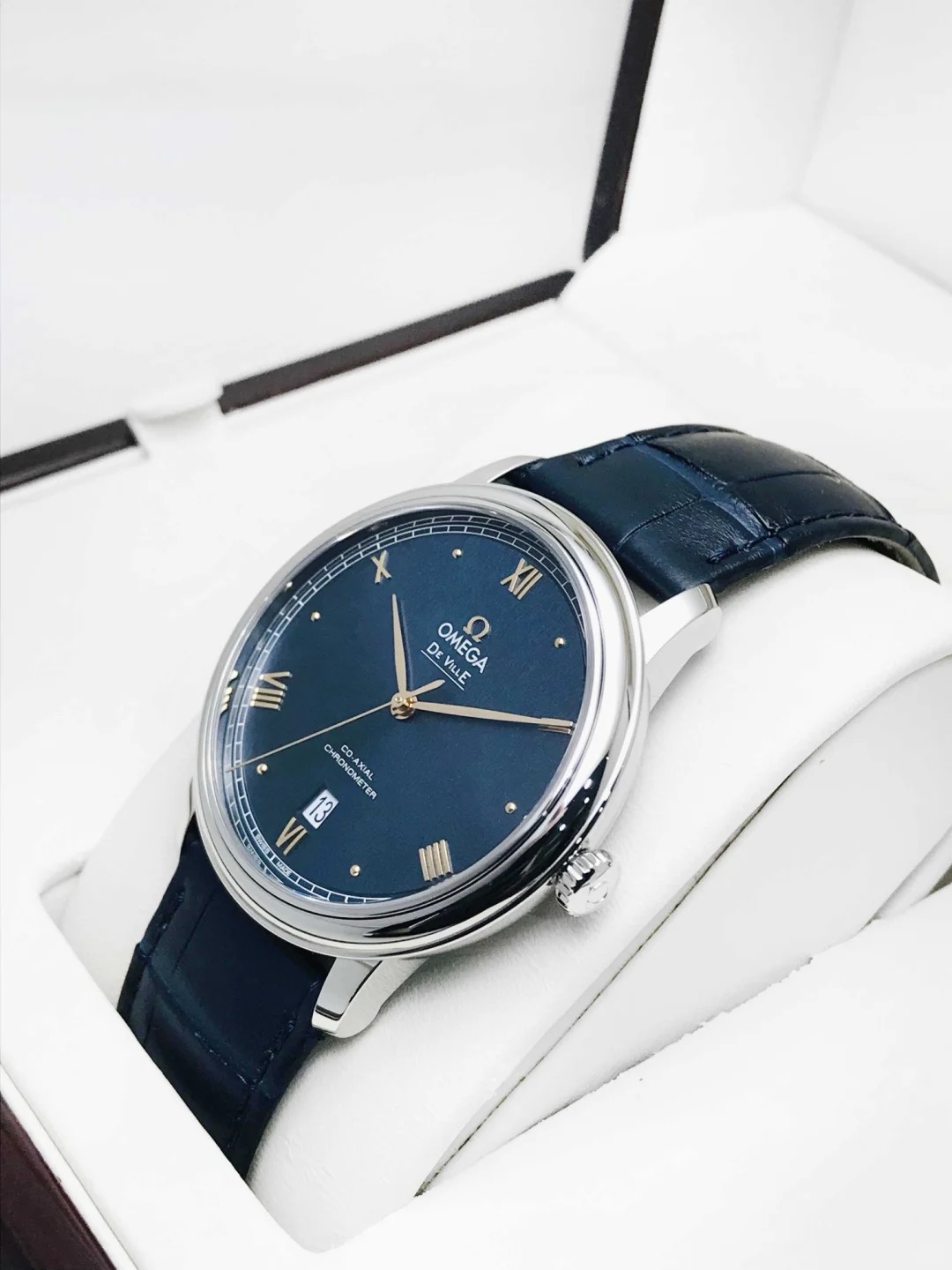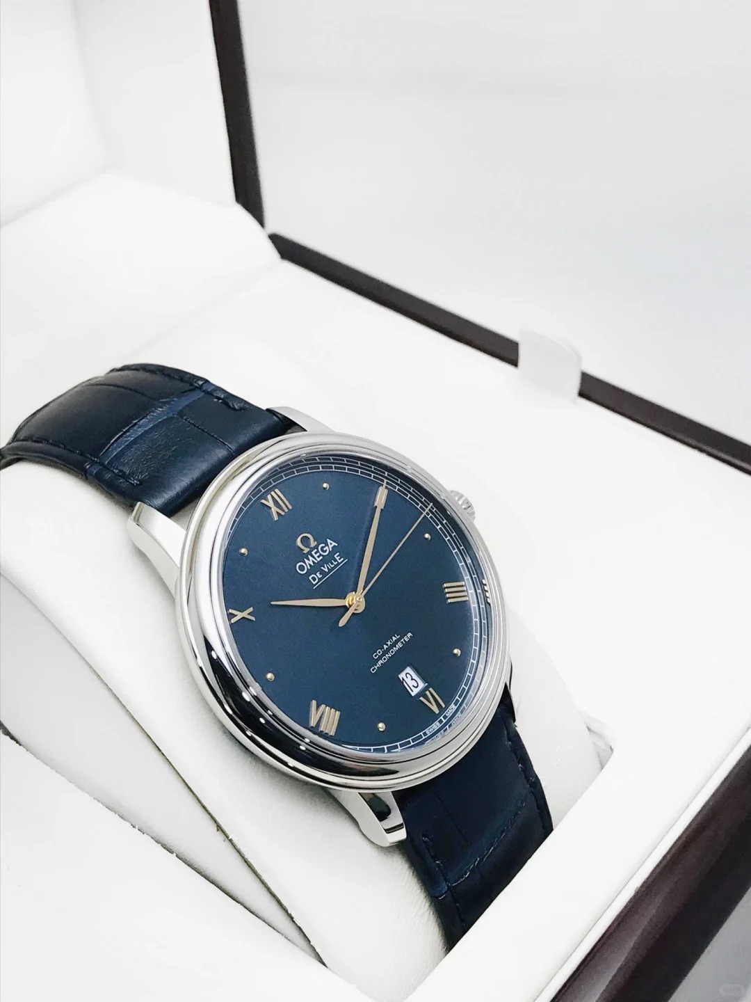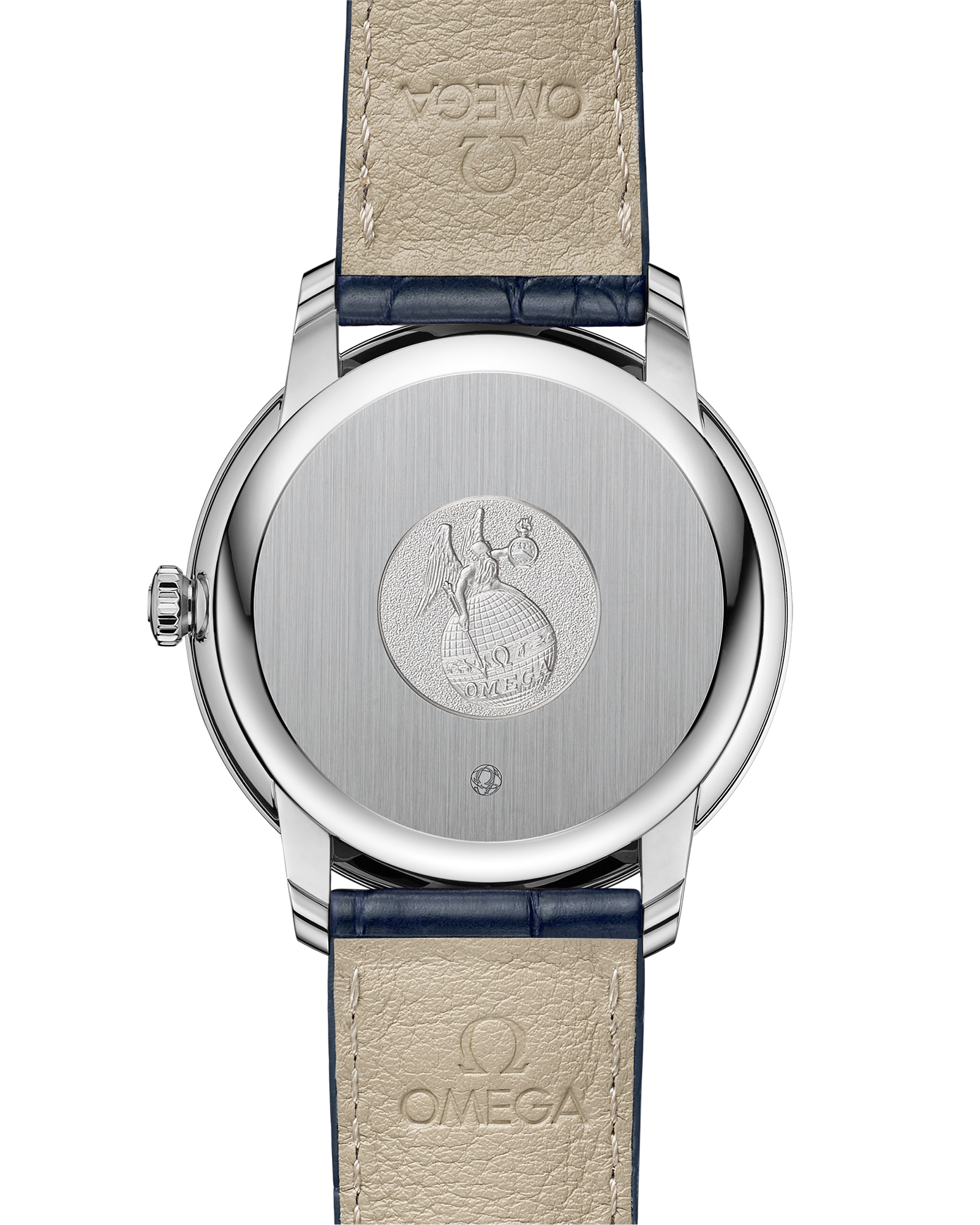 The 39.5 mm case features a stainless steel bezel and scratch-resistant sapphire crystal. presented on a blue leather strap. At the heart of the watch is the OMEGA Co-Axial calibre 2500.