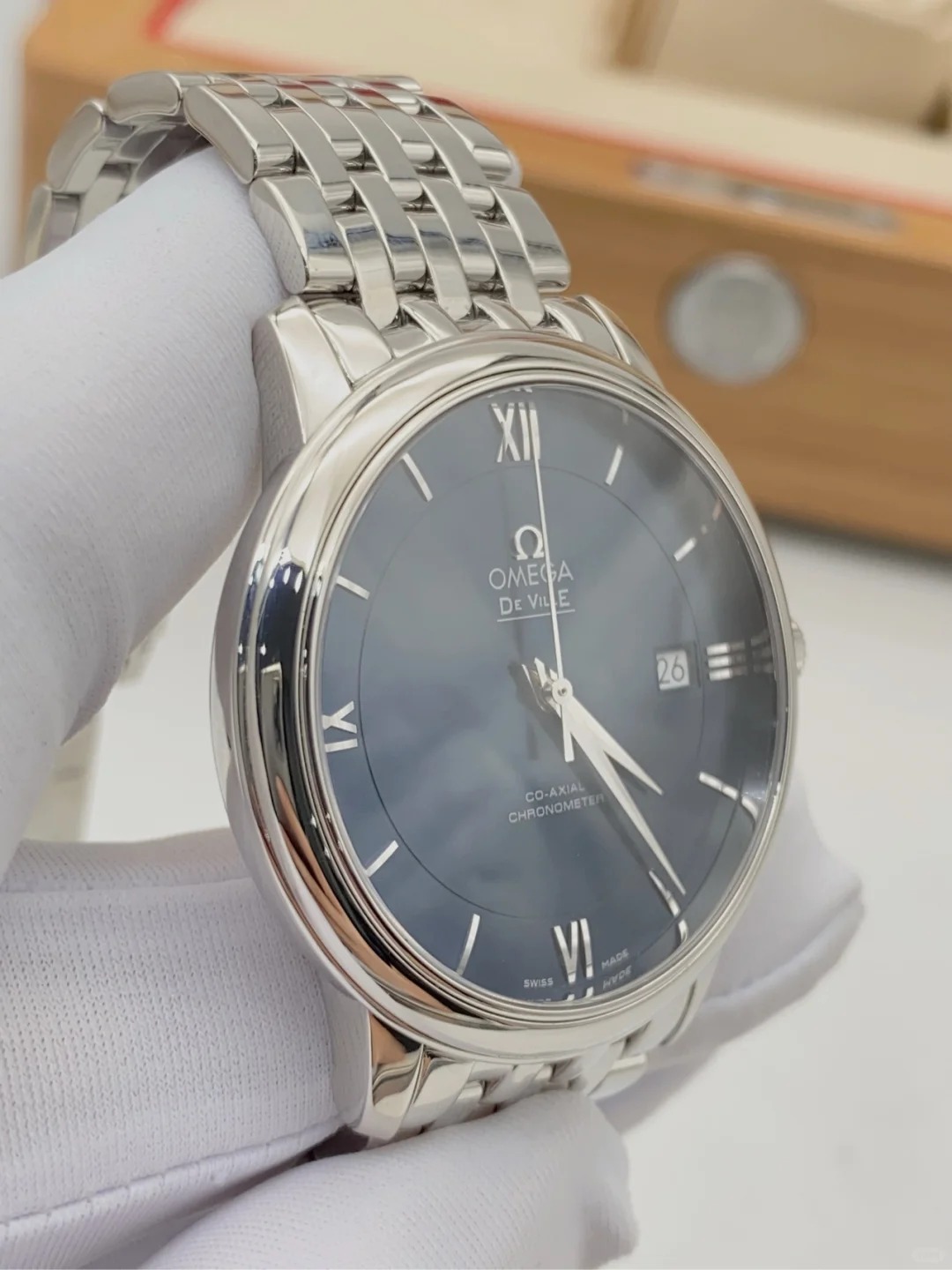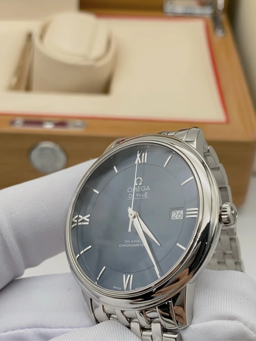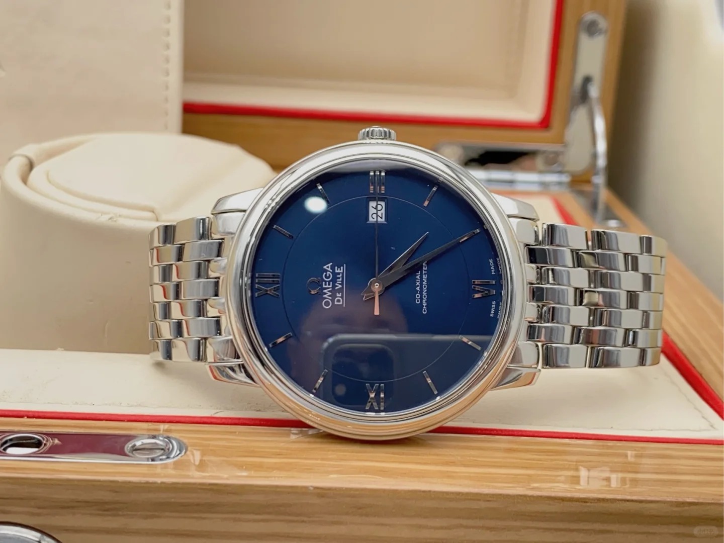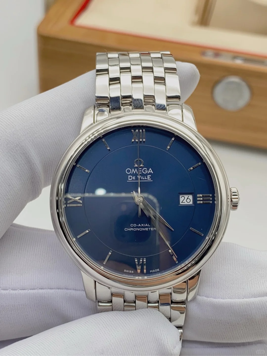 The watch features a sun-brushed blue dial with polished domed Roman numerals and hour markers.