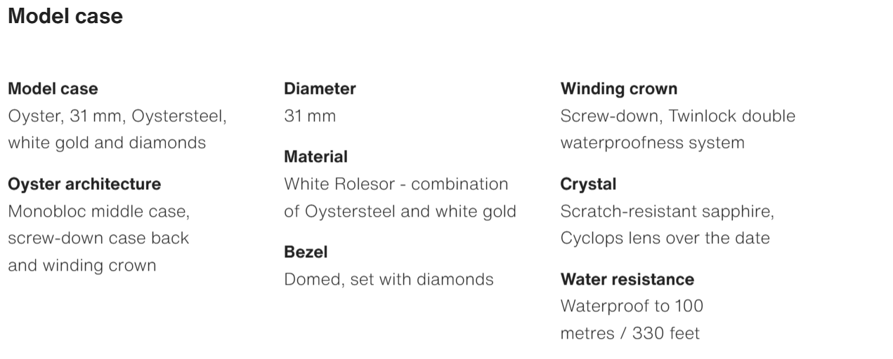 • The Oyster Perpetual Datejust 31 is available in white gold and Oystersteel. with a diamond-set white mother-of-pearl dial and an Oyster bracelet. -m278344rbr-0005