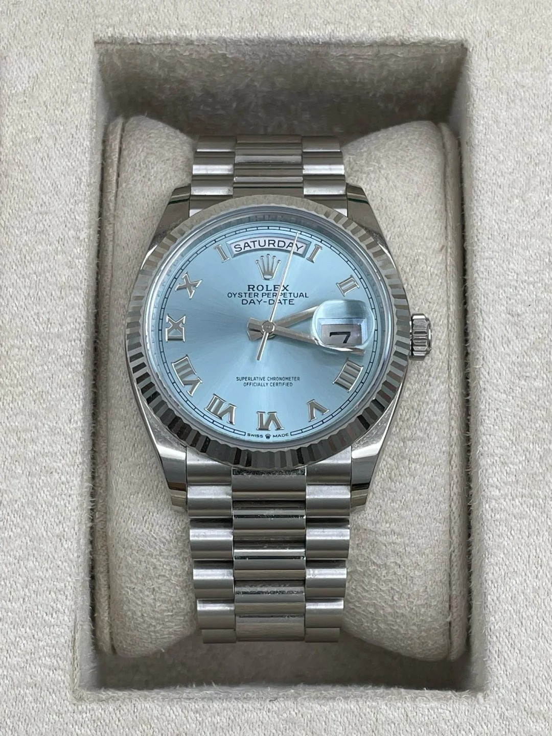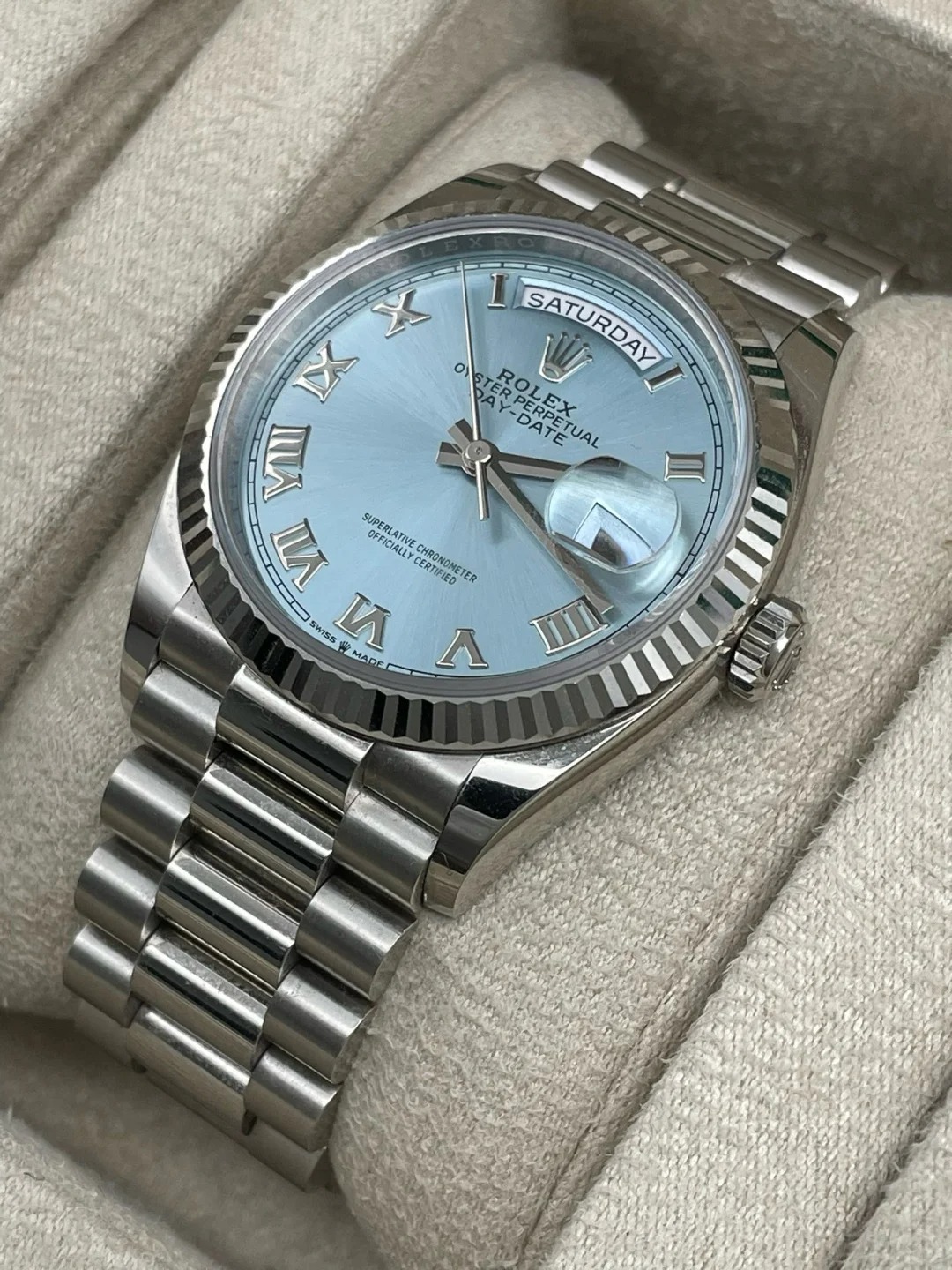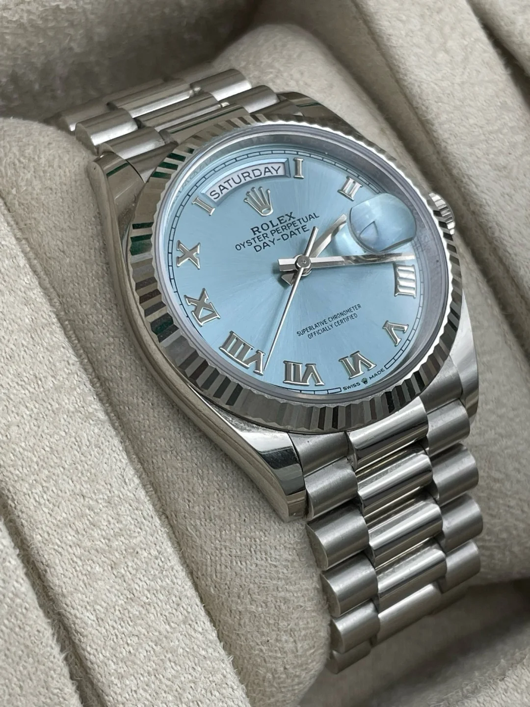 The Oyster Perpetual Day-Date 36 in platinum with an ice-blue dial. fluted bezel and President bracelet. -m128236-0018