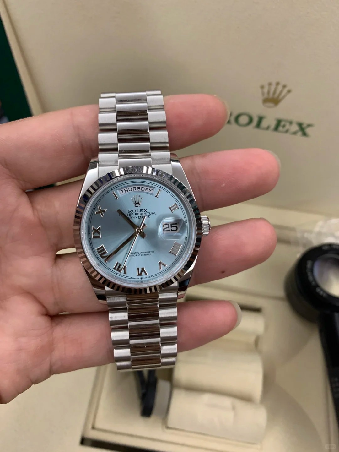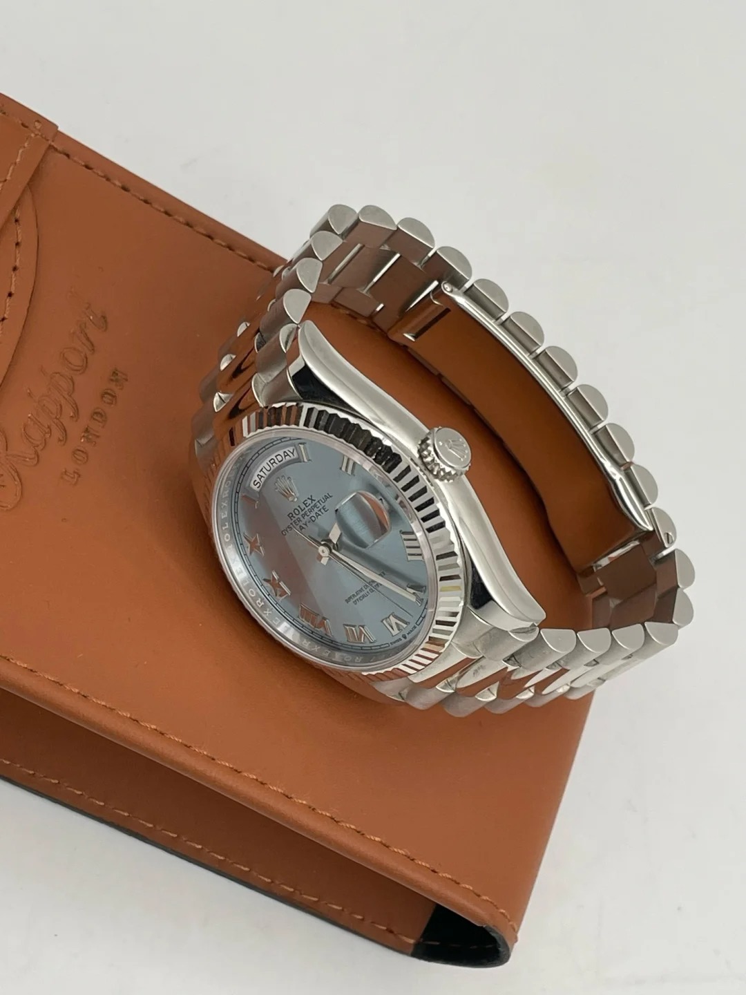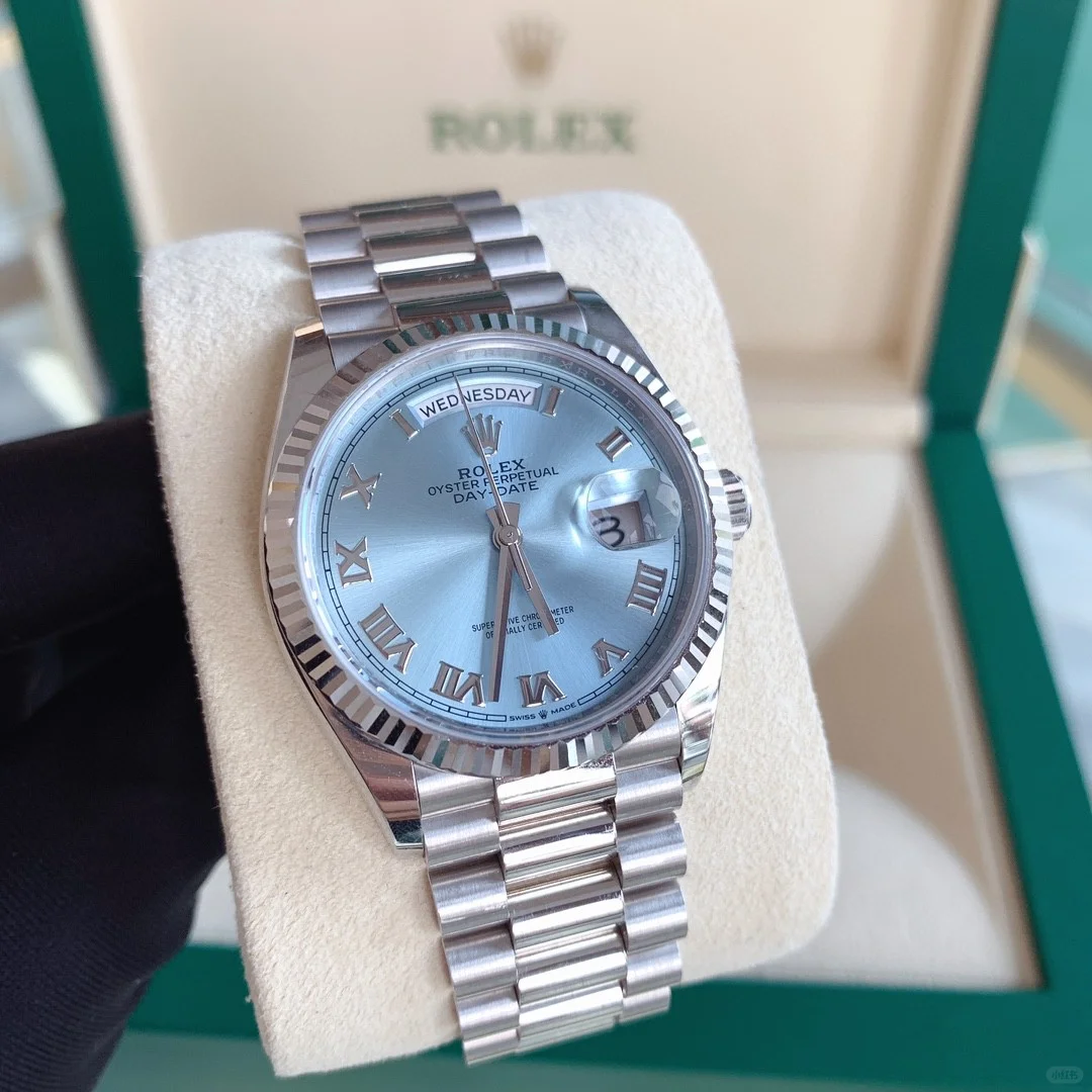 • The Oyster Perpetual Day-Date 36 in platinum with an ice-blue dial. fluted bezel and President bracelet. -m128236-0018