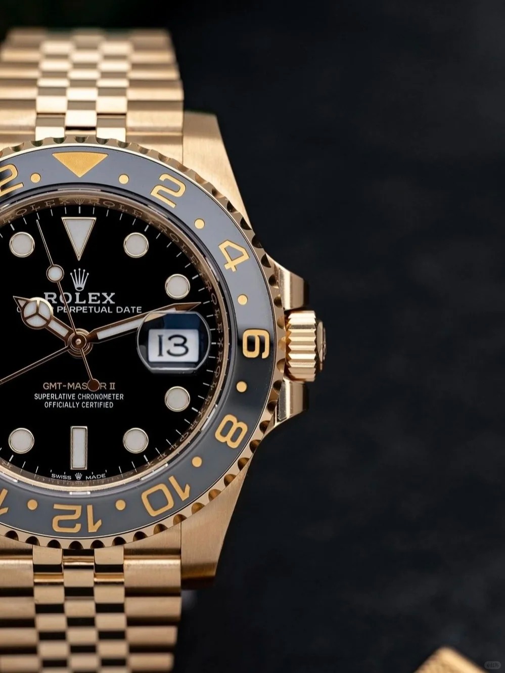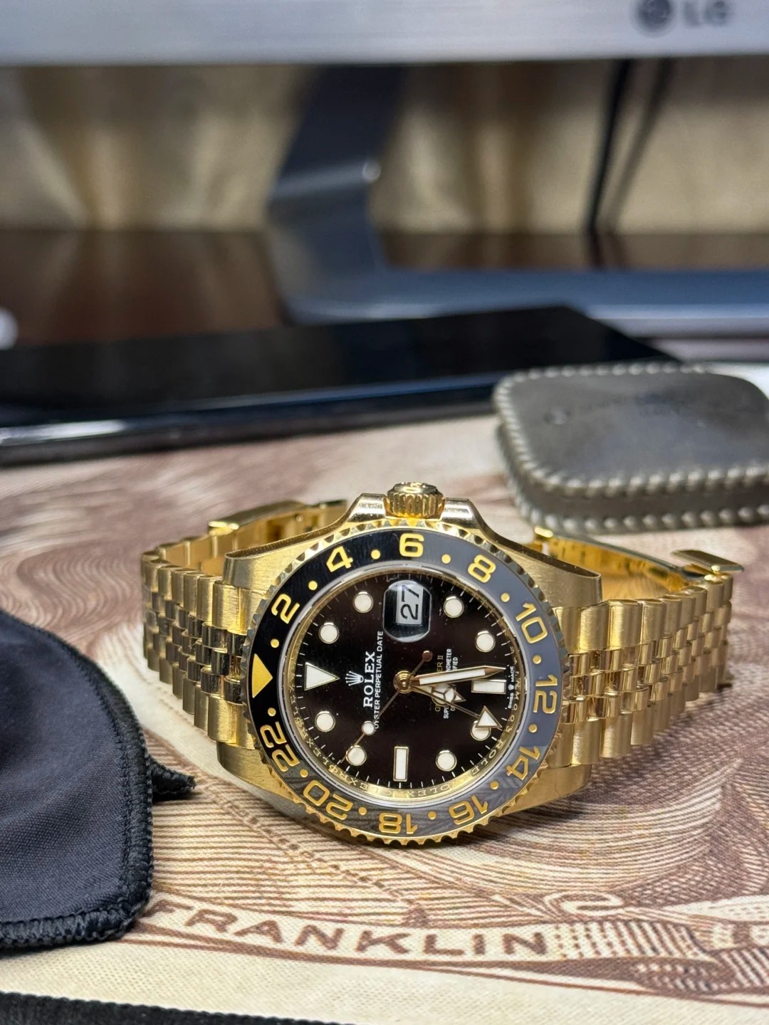 • The Oyster Perpetual GMT-Master II in 18K yellow gold with a black dial and Jubilee bracelet. -m126718grnr-0001 40mm