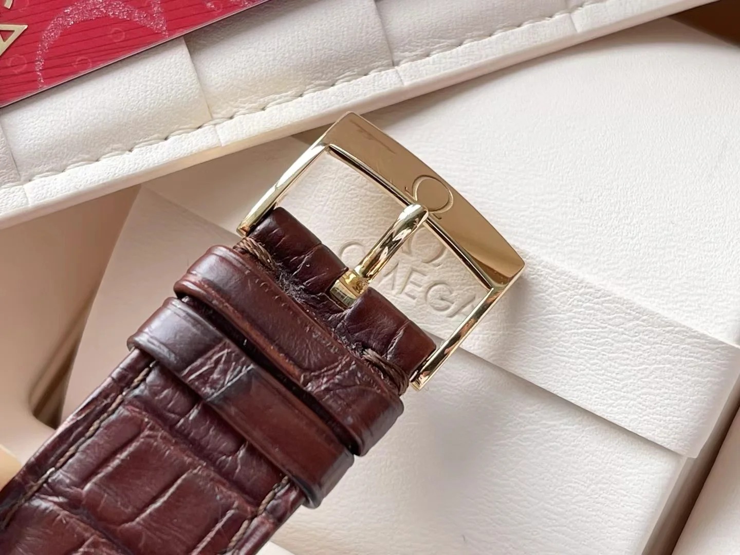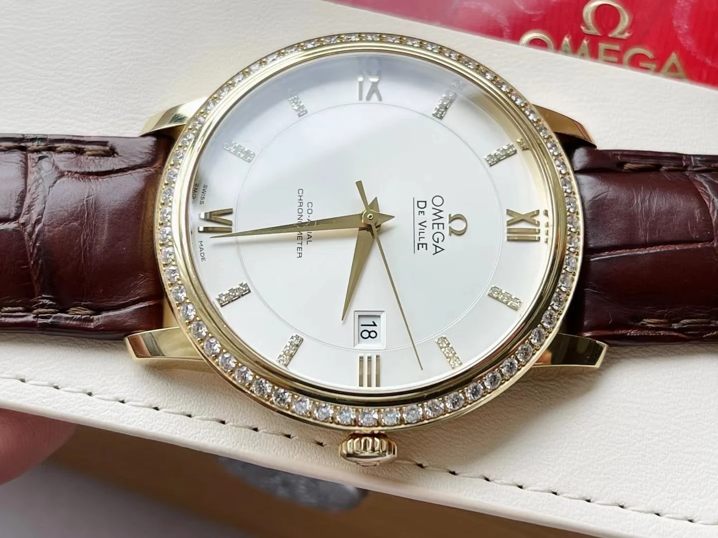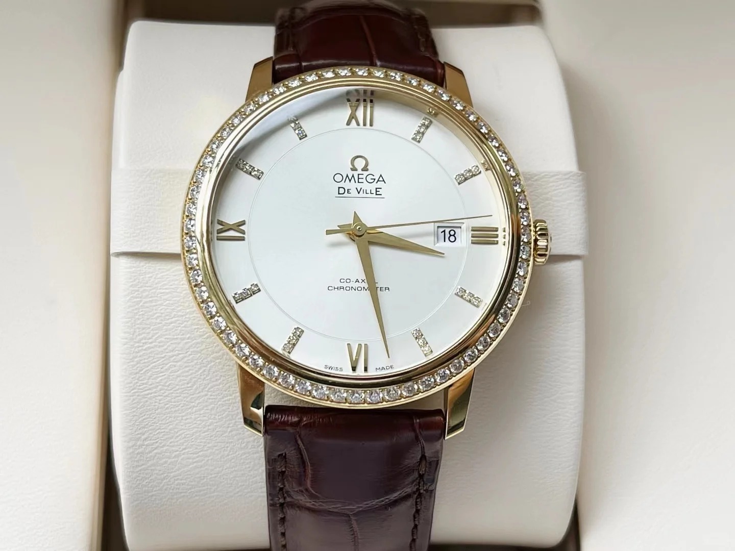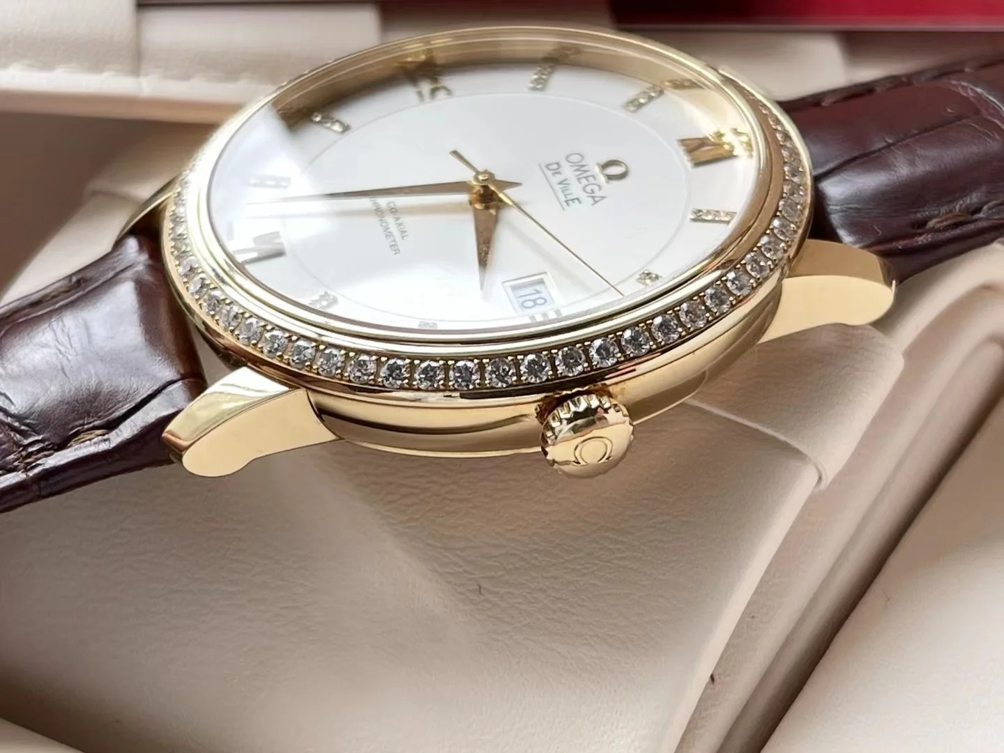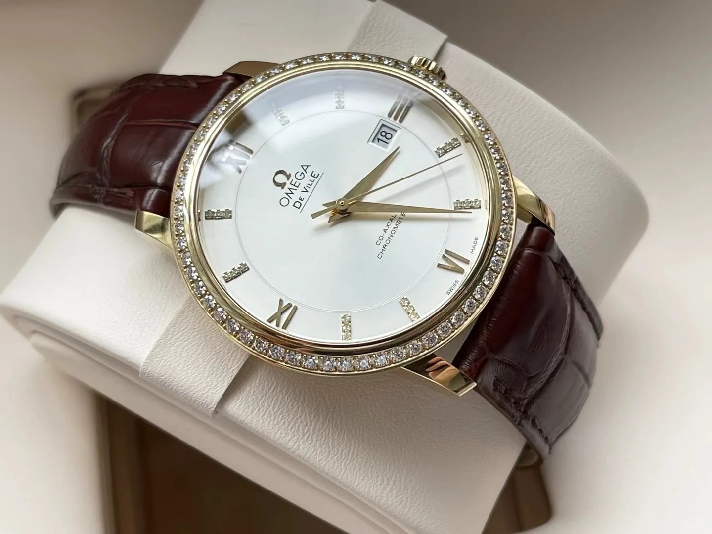 Housed in an 18K yellow gold case with a diamond-set bezel. the watch is presented on a brown leather strap and is powered by the OMEGA Co-Axial calibre 2500.