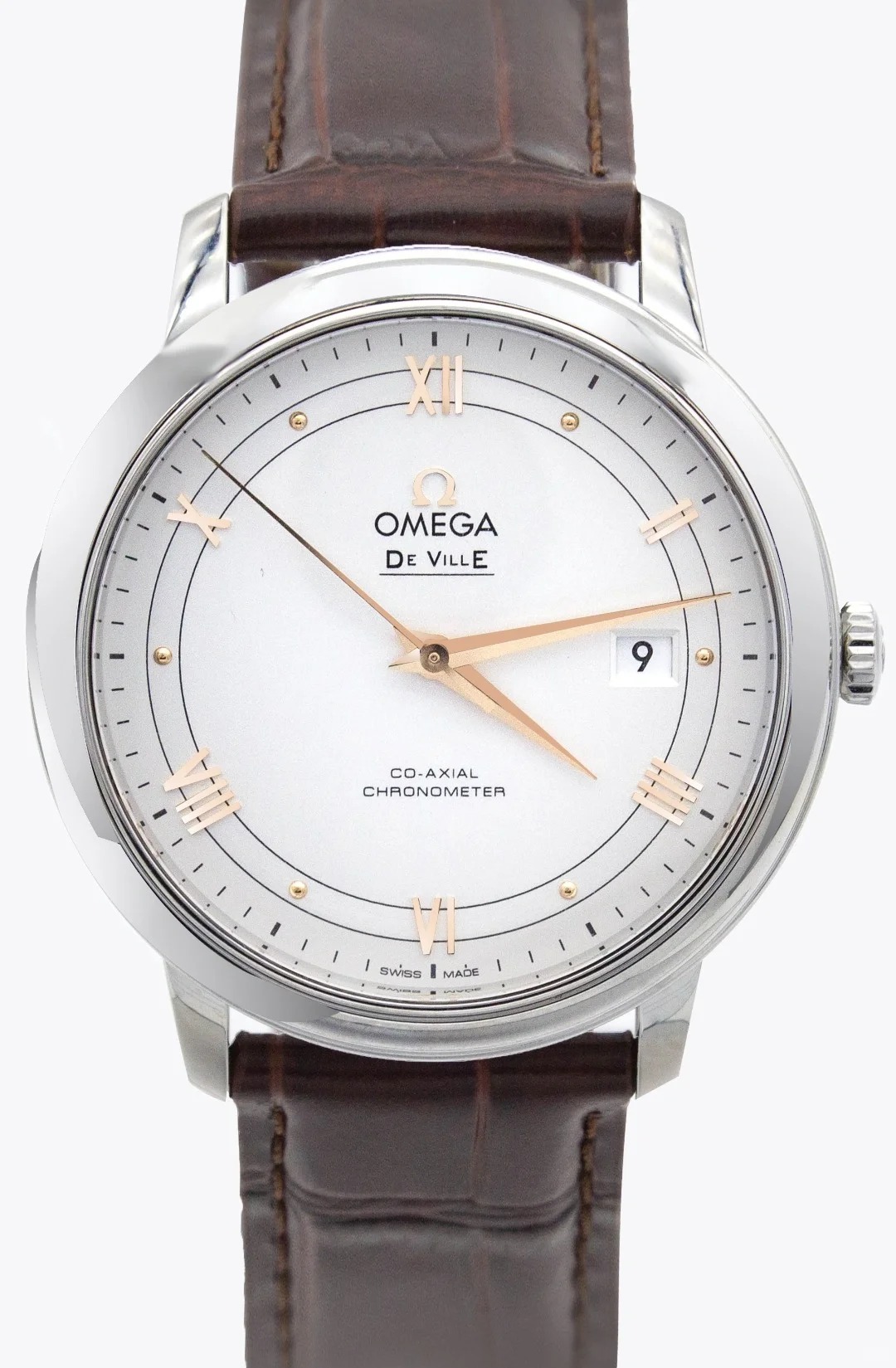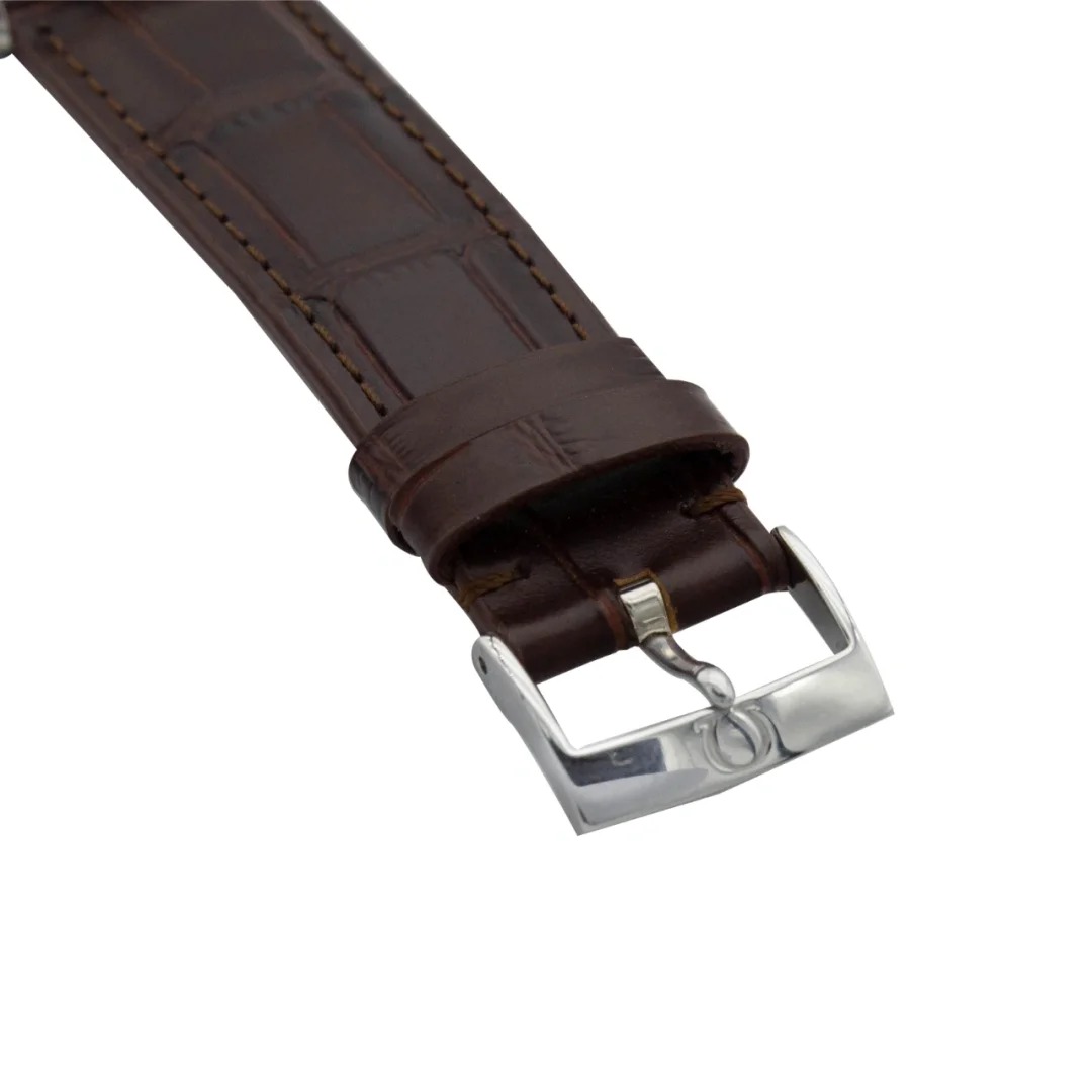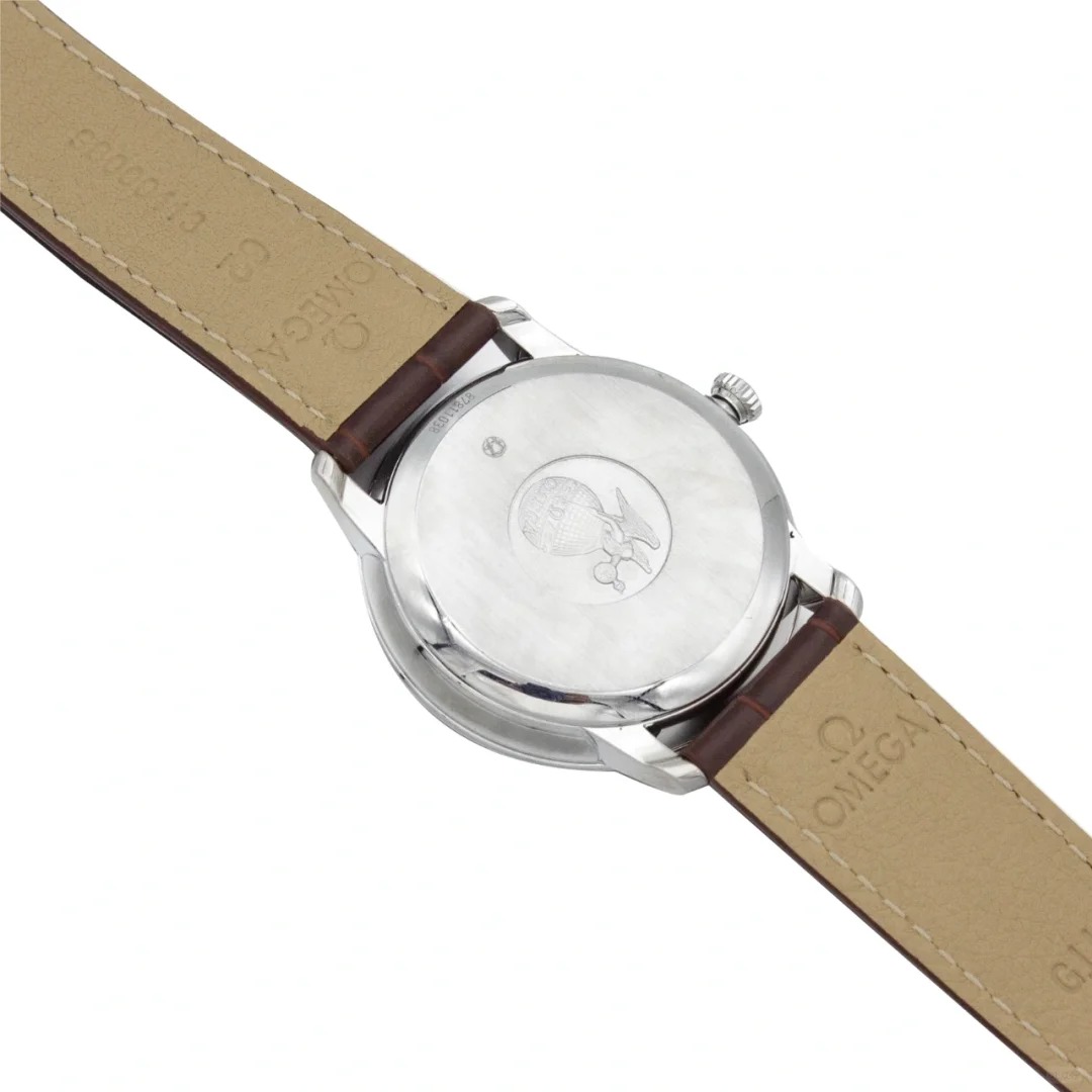 The watch is housed in a 39.5 mm stainless steel case and presented on a brown leather strap. At the heart of this timepiece is the Co-Axial calibre 2500.
