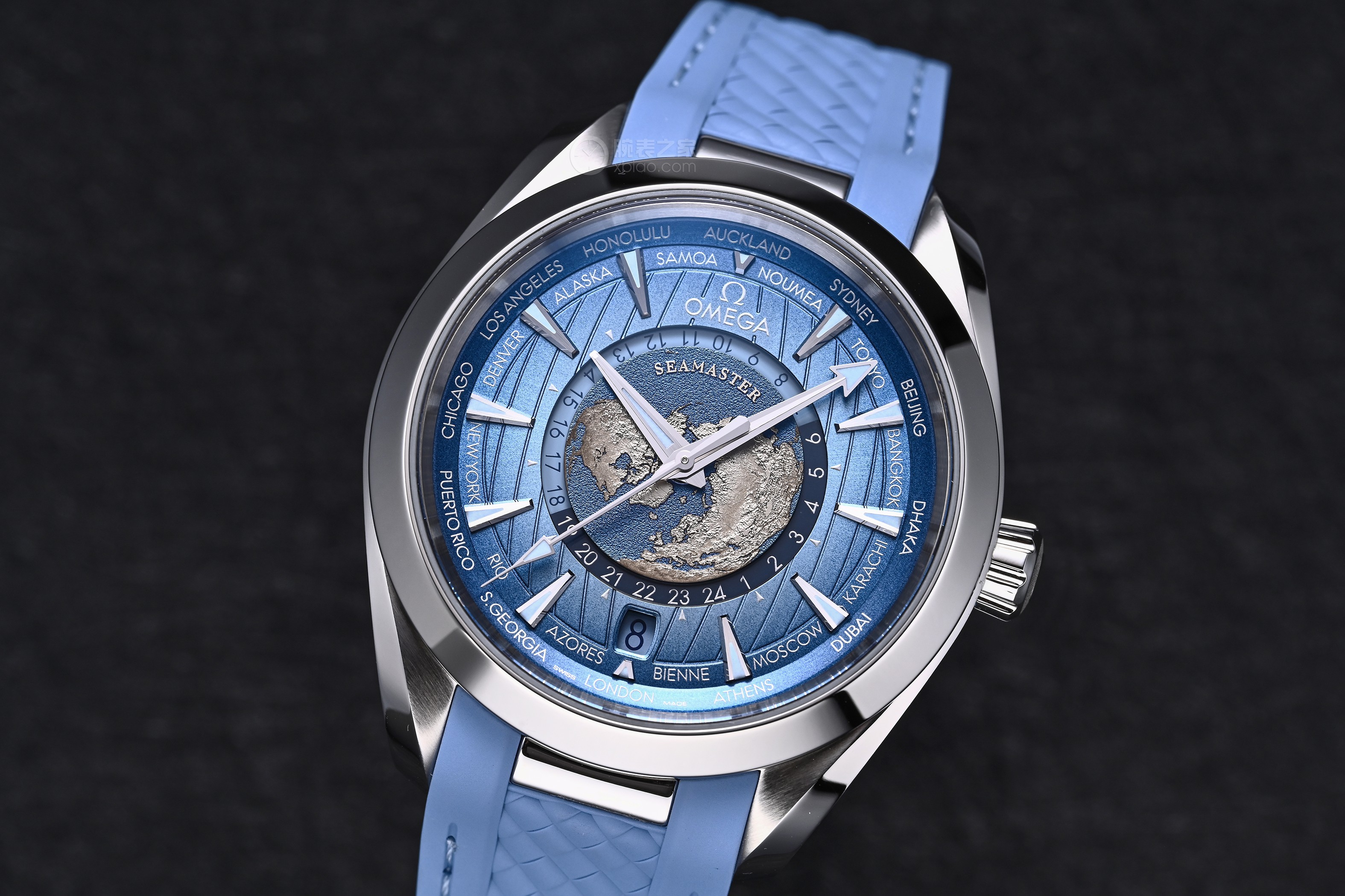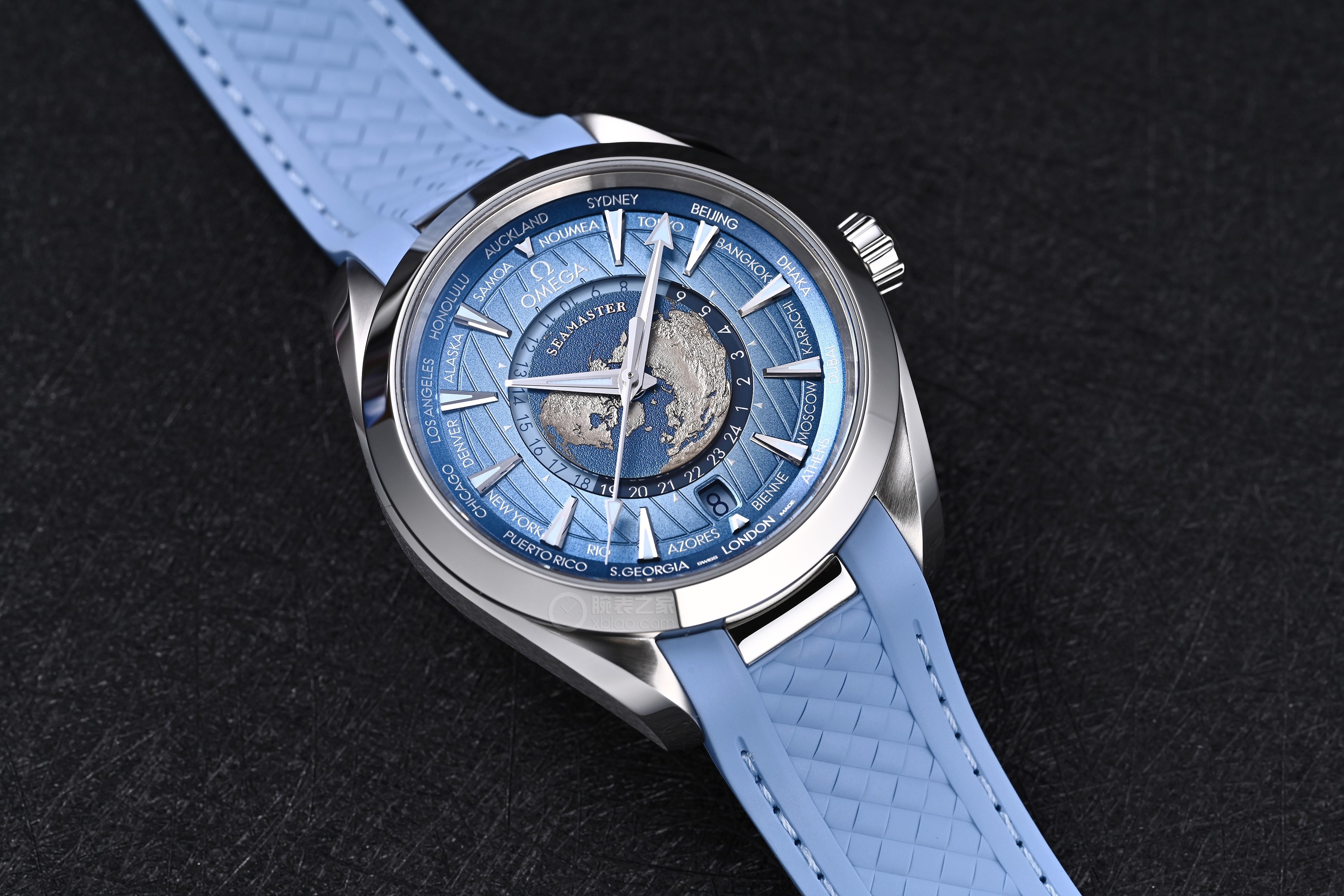The 43 mm case of this worldtimer is made of polished and brushed stainless steel and is fitted with an integrated blue rubber strap that is connected to the case by polished solid steel links.