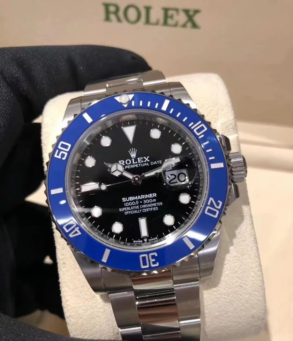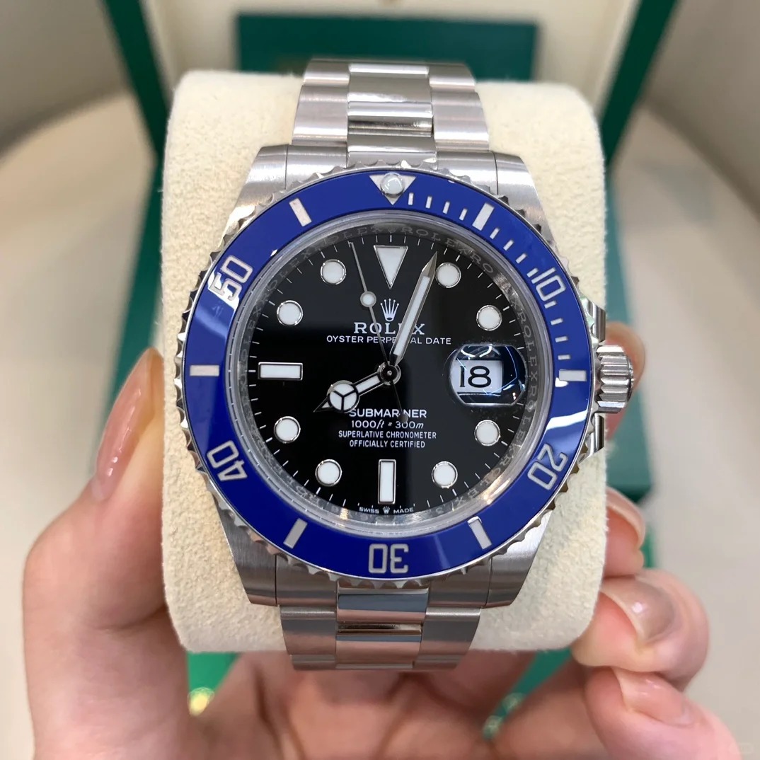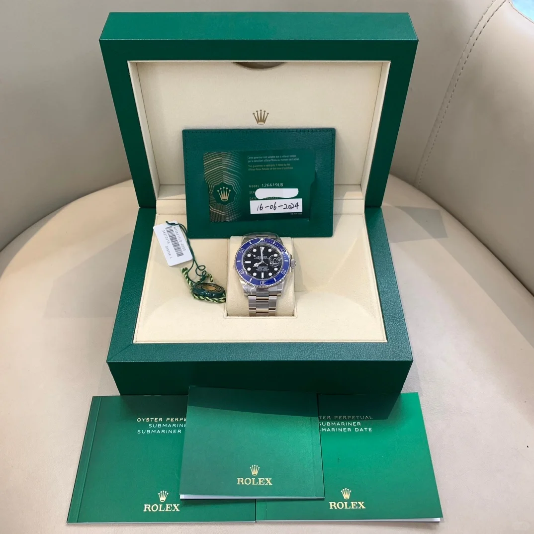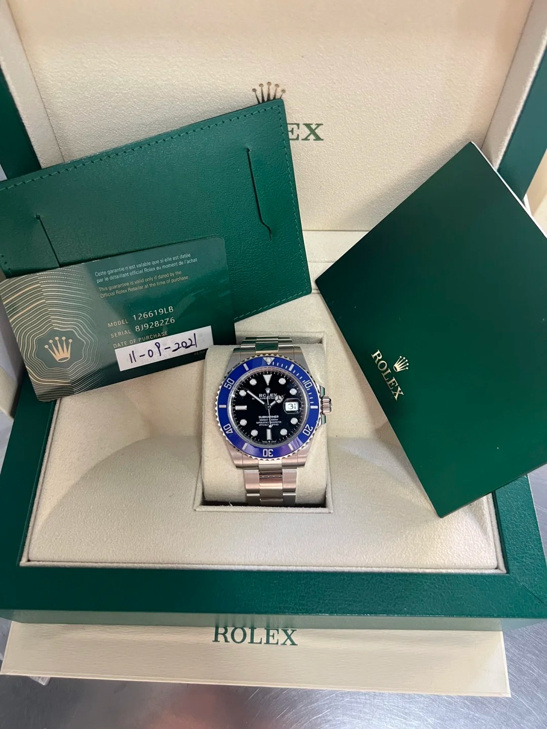 The Oyster Perpetual Submariner Date in 18K white gold with a blue Cerachrom insert in ceramic. a black dial and oversized luminescent hour markers. -m126619lb-0003 41mm
