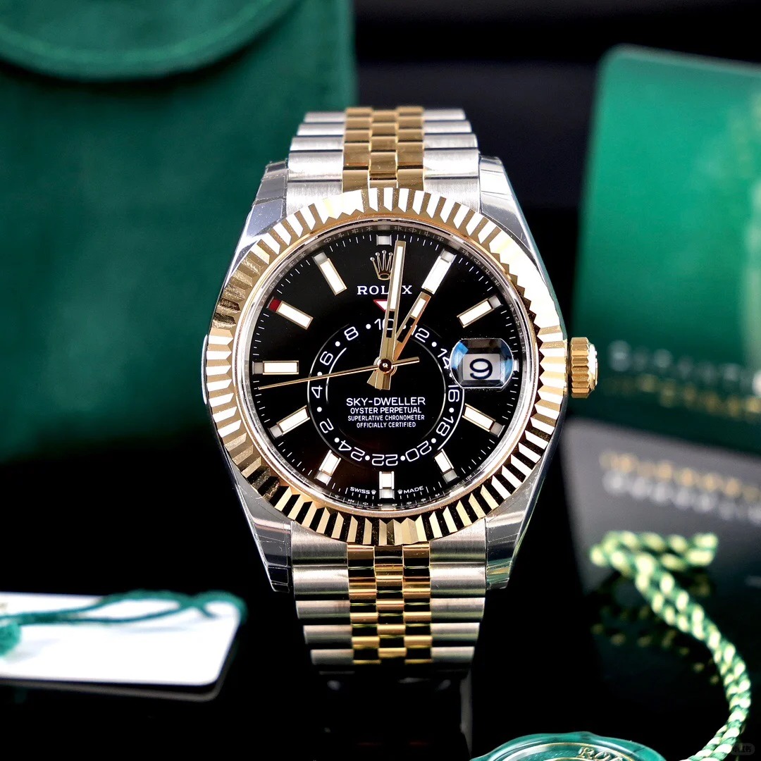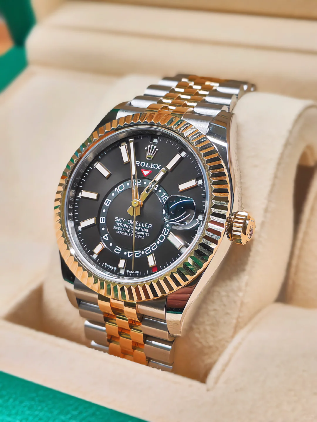 The Oyster Perpetual Sky-Dweller in yellow gold and Oystersteel with a glossy black dial and a Jubilee bracelet. -m336933-0004 42mm