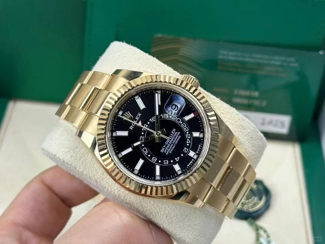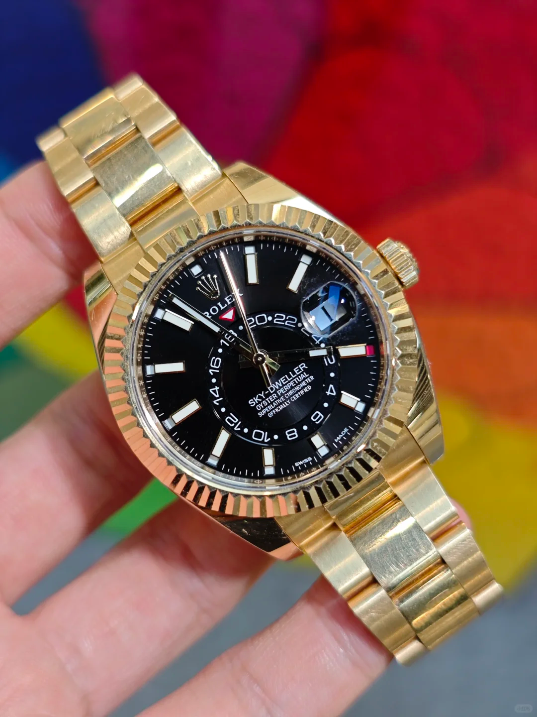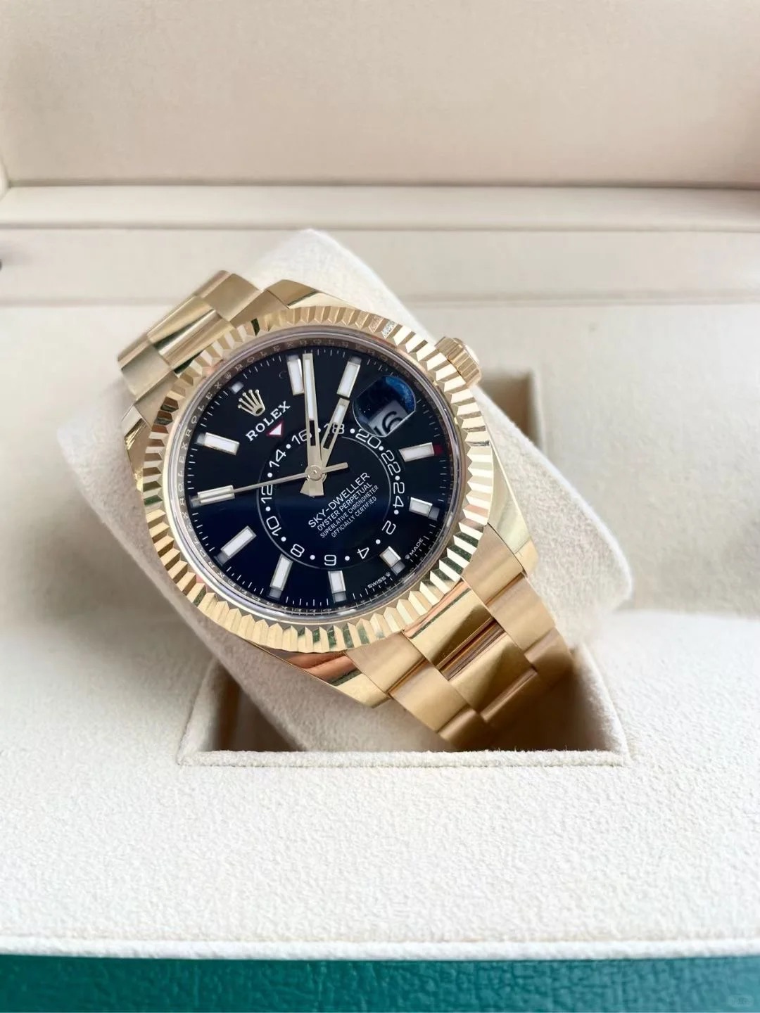 The Oyster Perpetual Sky-Dweller is available in 18 ct yellow gold with a glossy black dial and an Oyster bracelet. -m336938-0002 42mm