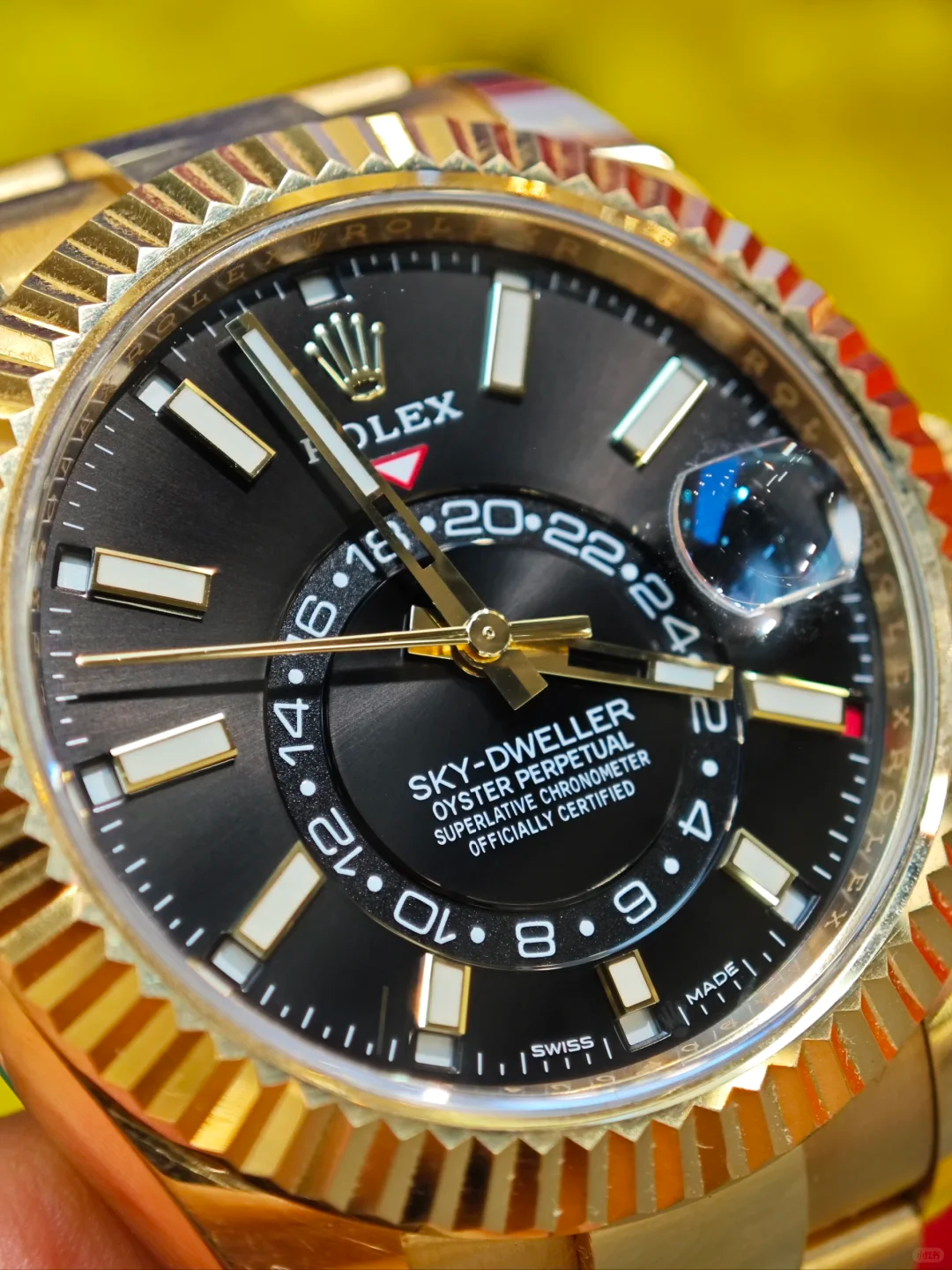 • The Oyster Perpetual Sky-Dweller is available in 18 ct yellow gold with a glossy black dial and an Oyster bracelet. -m336938-0002 42mm