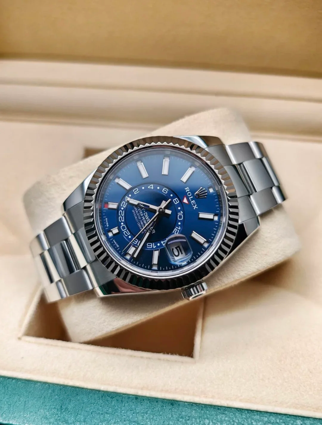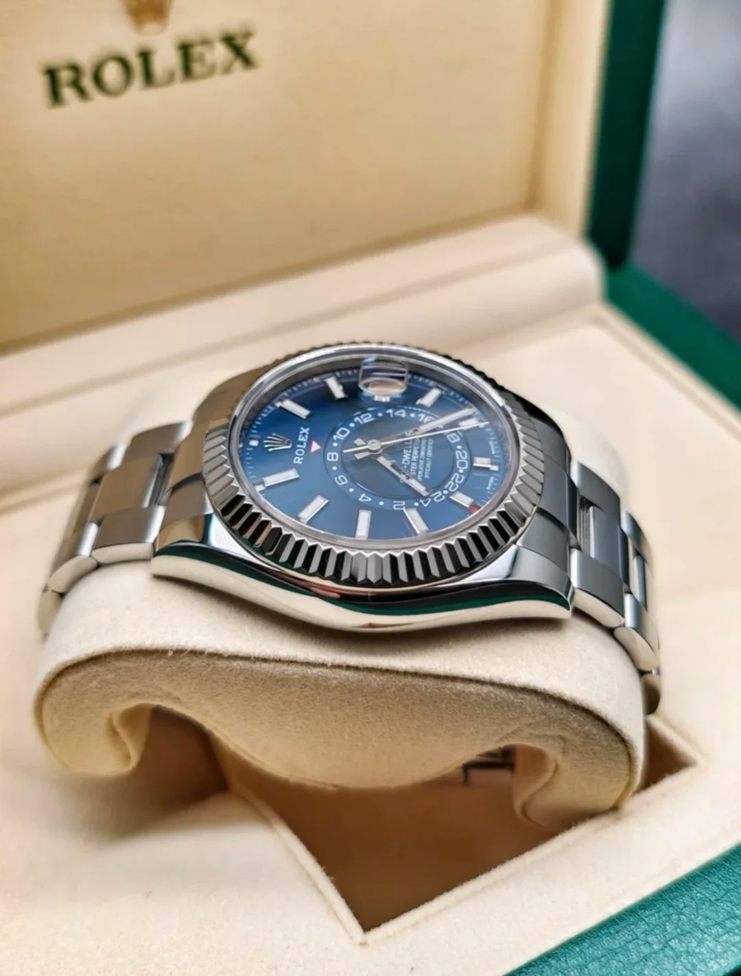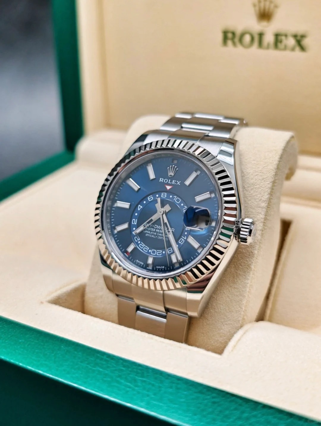 The watch is unworn and comes complete with full set of original accessories. such as watch box. warranty card dated recently. booklets and manuals.