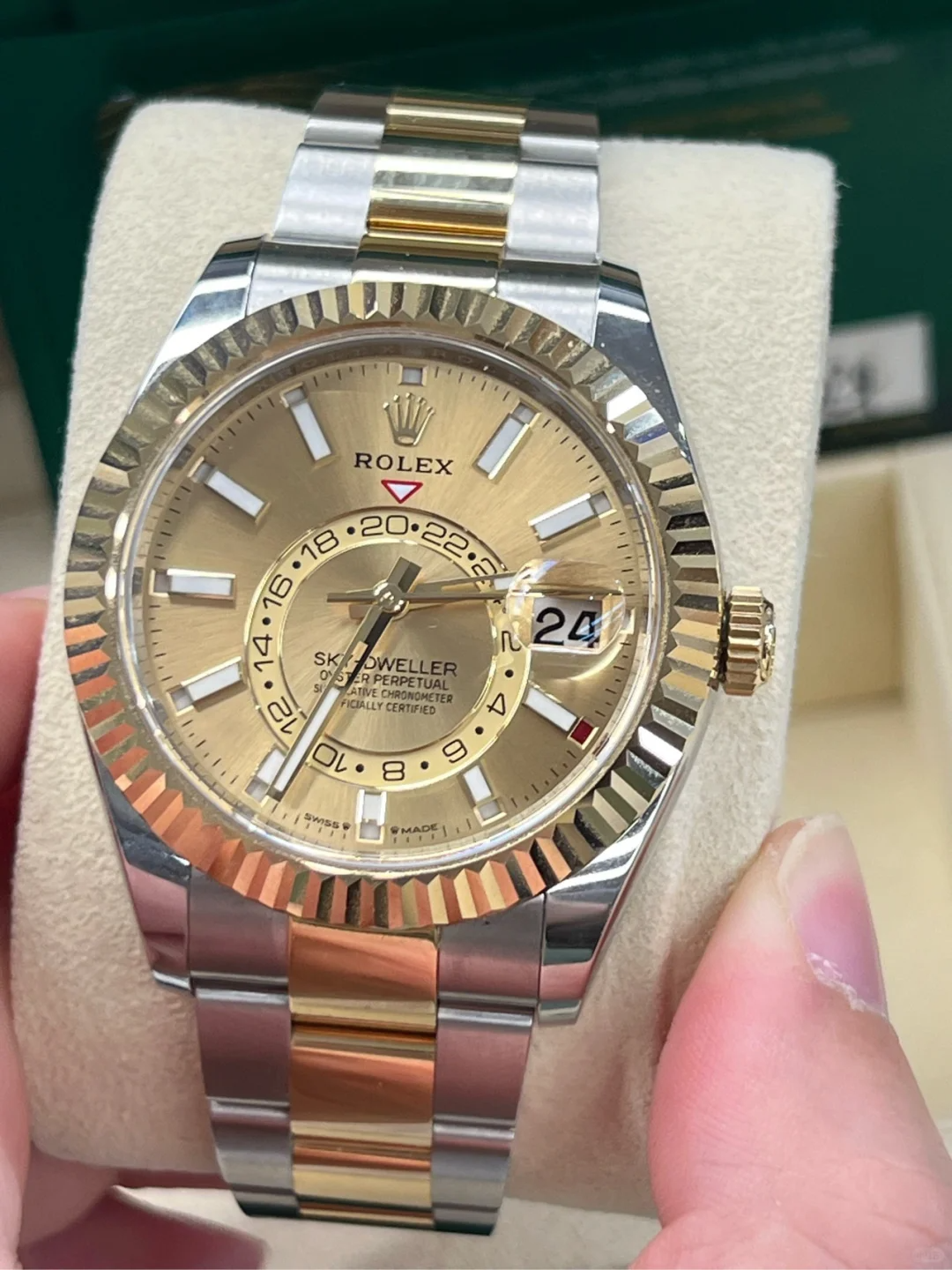 • The Oyster Perpetual Sky-Dweller is available in yellow gold and Oysteel. with a glossy black dial and an Oyster bracelet. -m336933-0003 42mm