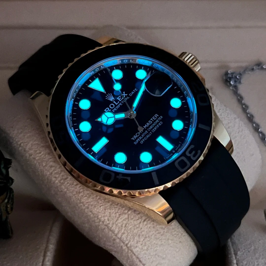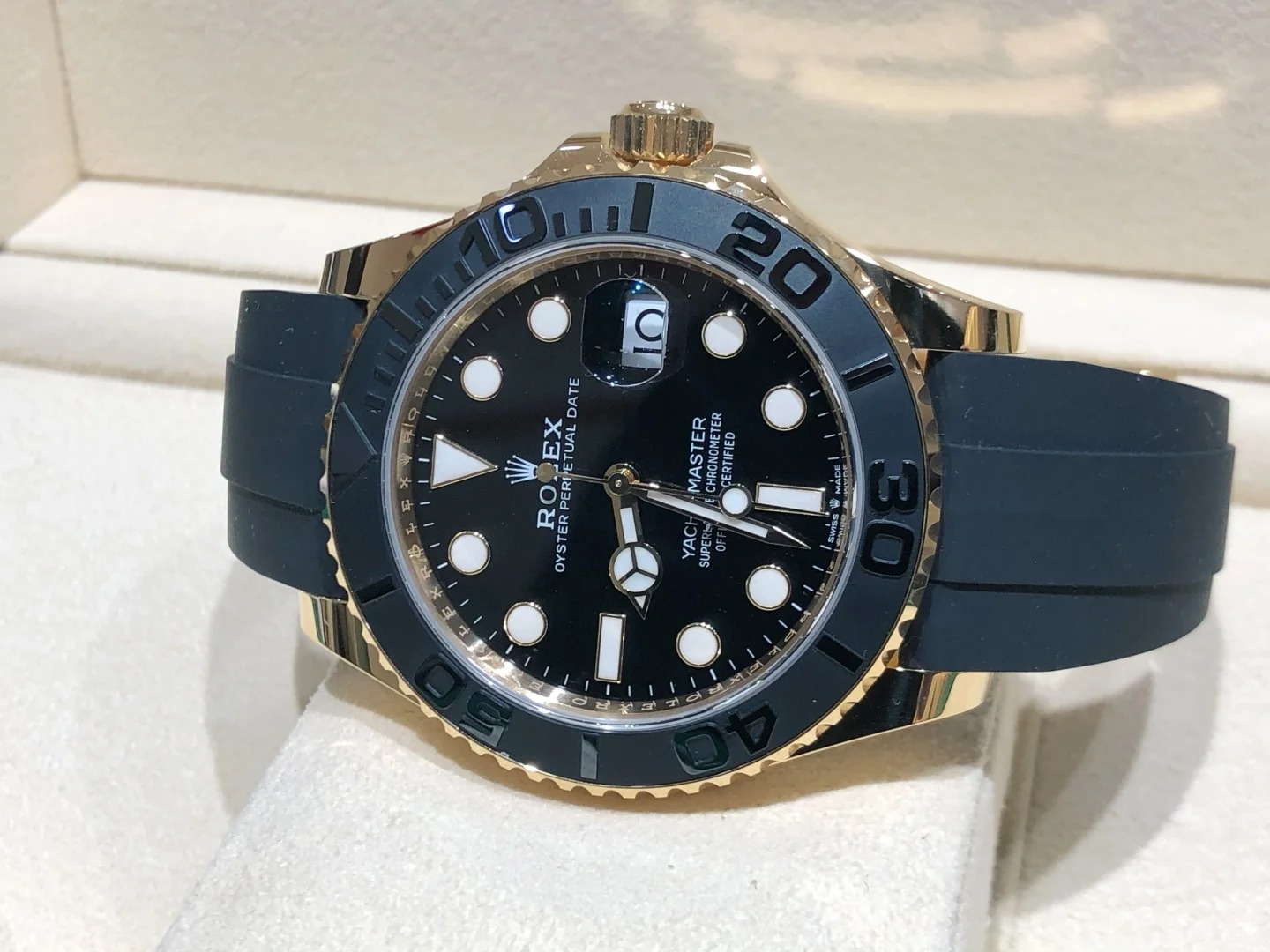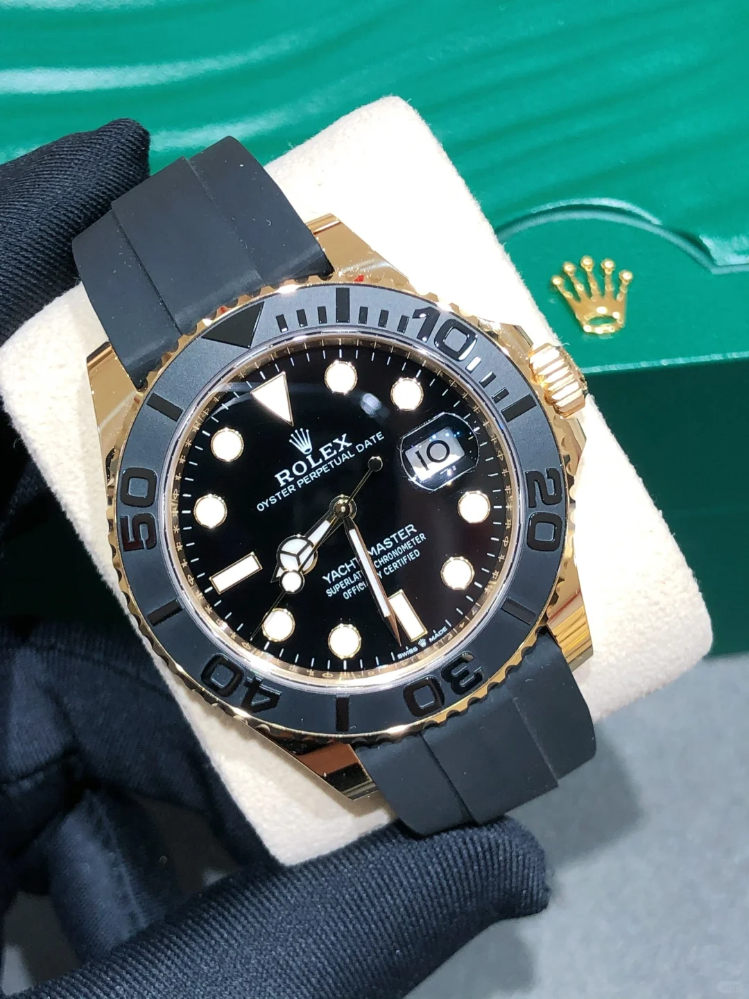 • The Oyster Perpetual Yacht-Master 42 is available in 18 ct yellow gold with a black dial and an Oysterflex strap. -m226658-0001
