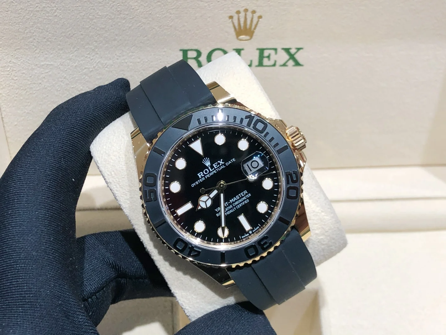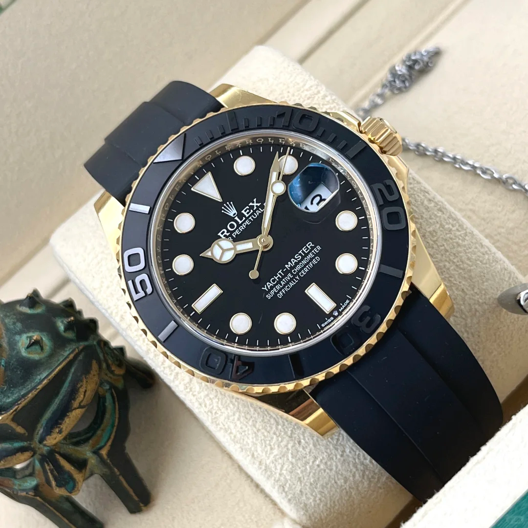 The Oyster Perpetual Yacht-Master 42 is available in 18 ct yellow gold with a black dial and an Oysterflex strap. -m226658-0001