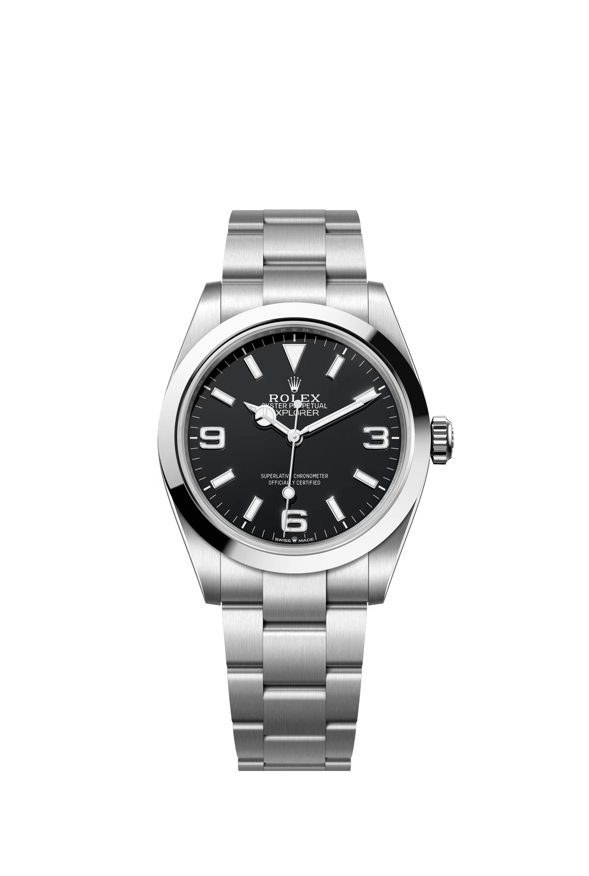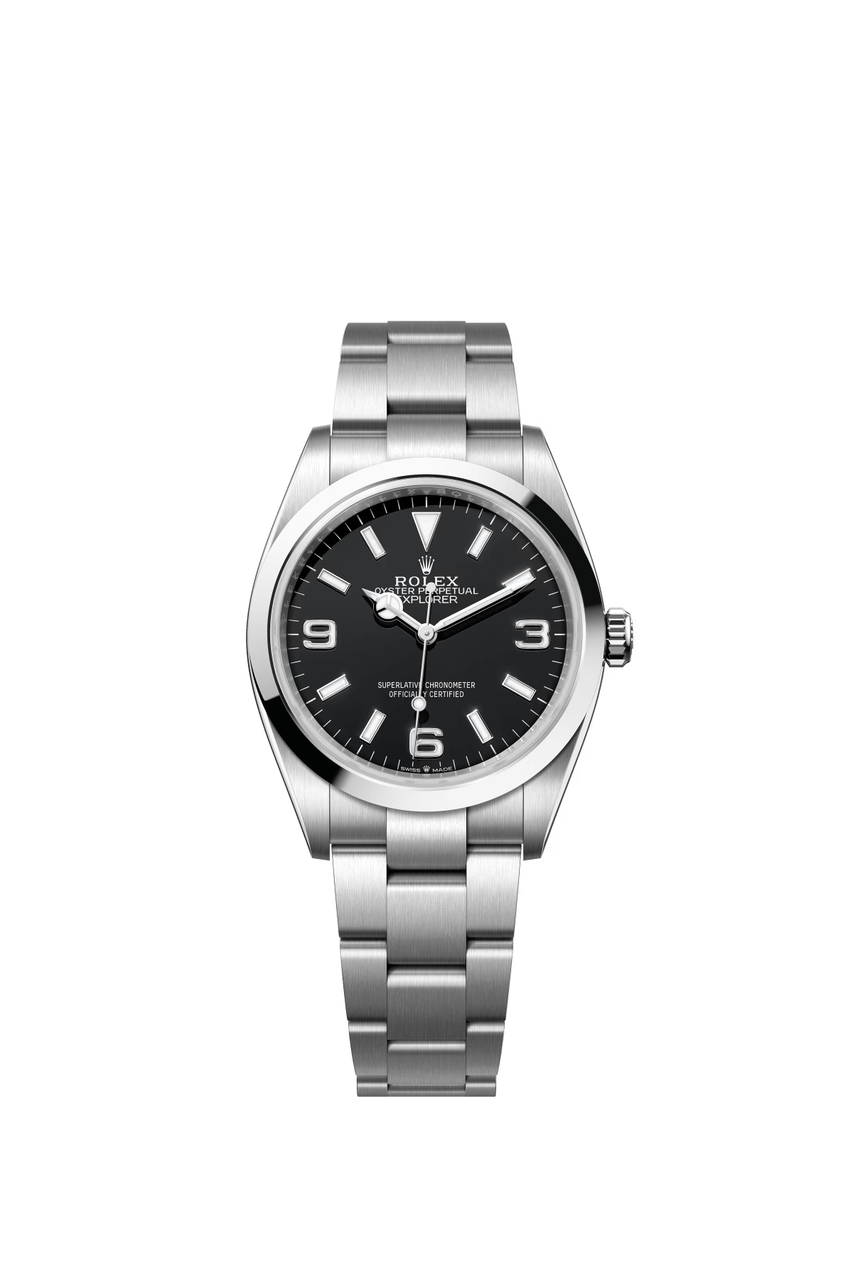 The Oyster Perpetual Explorer 36 is made of Oyster steel and features a distinctive black dial featuring the 3. 6 and 9 numerals coated with Chromalight. -m124270-0001