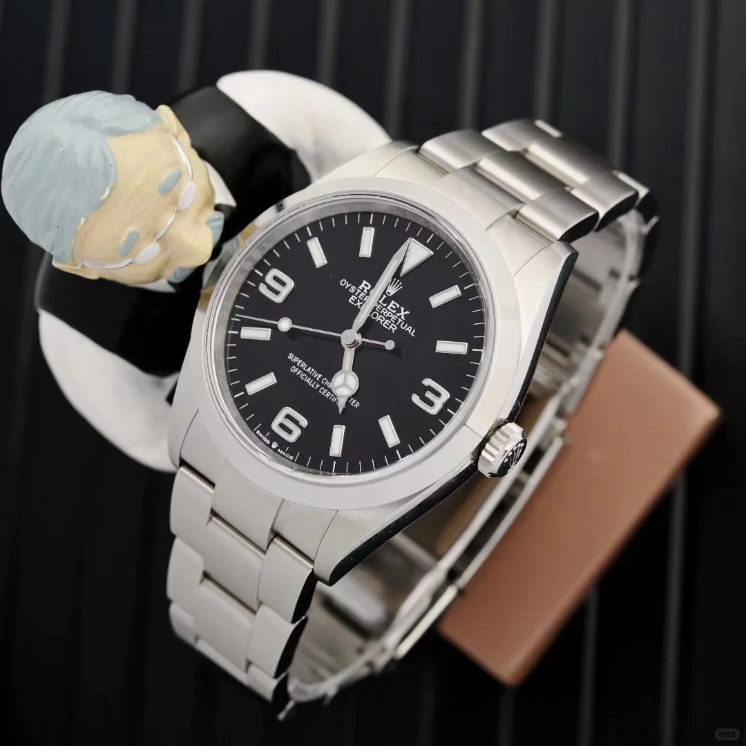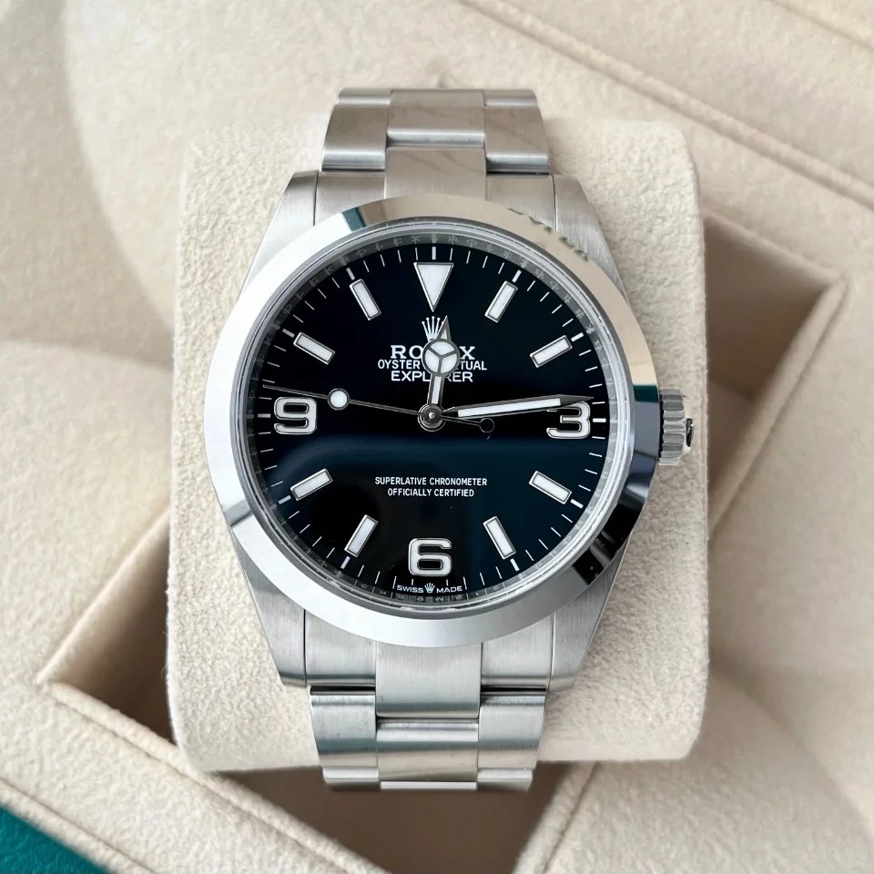 The Oyster Perpetual Explorer 40 is made of Oyster steel with a distinctive black dial featuring the 3. 6 and 9 numerals coated with Chromalight. -m224270-0001