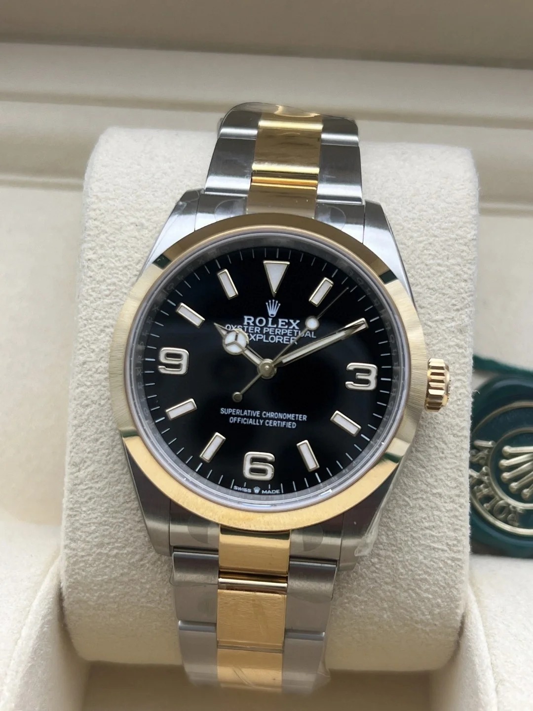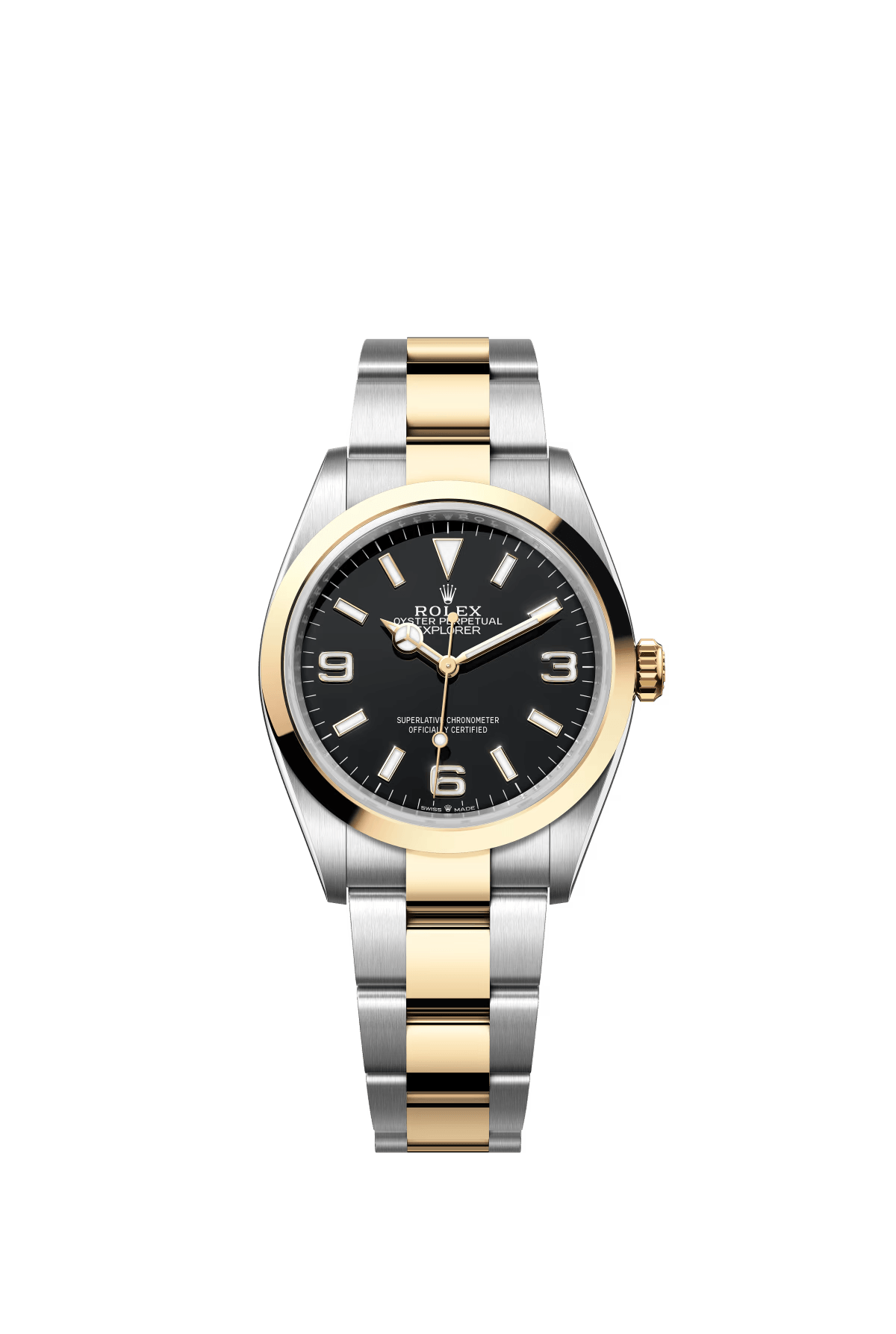 The Oyster Perpetual Explorer 36 is available in yellow gold and Oystersteel with a distinctive black dial featuring Chromalight numerals 3. 6 and 9. -m124273-0001