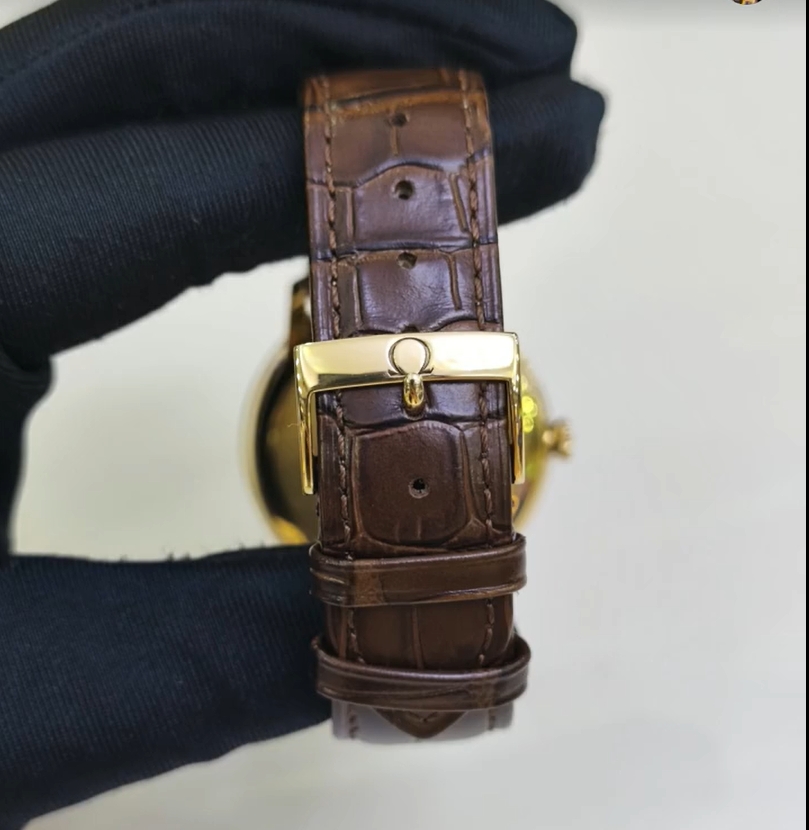 Housed in a 39.5 mm 18K yellow gold case and presented on a brown leather strap. the watch is powered by the OMEGA Co-Axial calibre 2500.